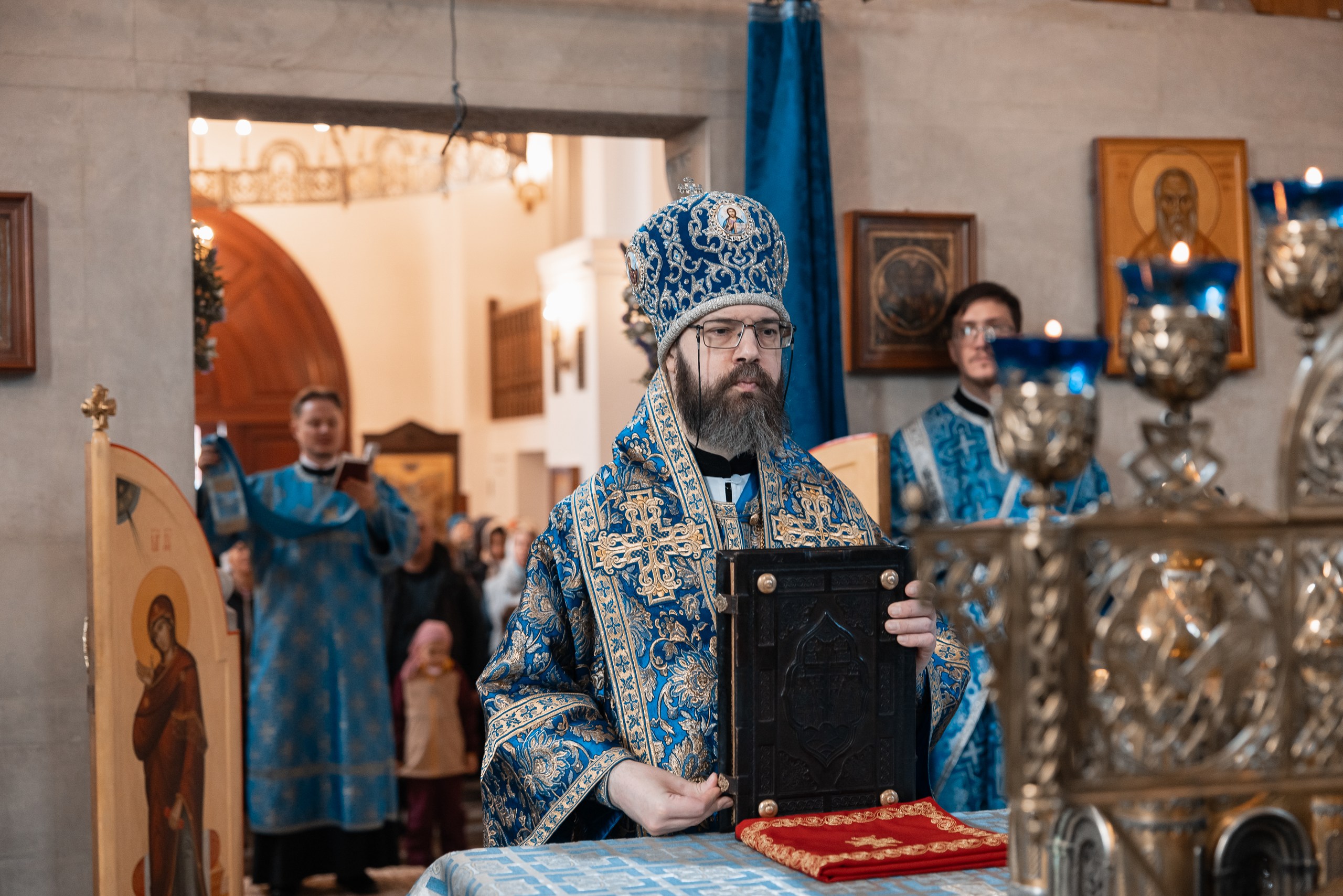 Его Высокопреосвященству сослужили: благочинный Спасского округа иерей Игорь Константинов, настоятель храма иерей Григорий Геронимус, секретарь Северо-Западного викариатства иерей Максим Павленко, ответственные за миссионерство и катехизацию на приходах викариатства в священном сане, а также клирики храма. За богослужением молился клирик нашего храма иерей Александр Сухоруков.