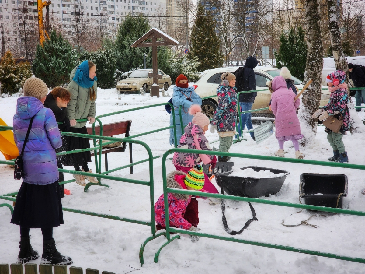 Строительство снежной горки. В первые дни нового года мы вместе строили во дворе храма большую снежную горку для детей. Это был весёлый и по-настоящему общий труд!