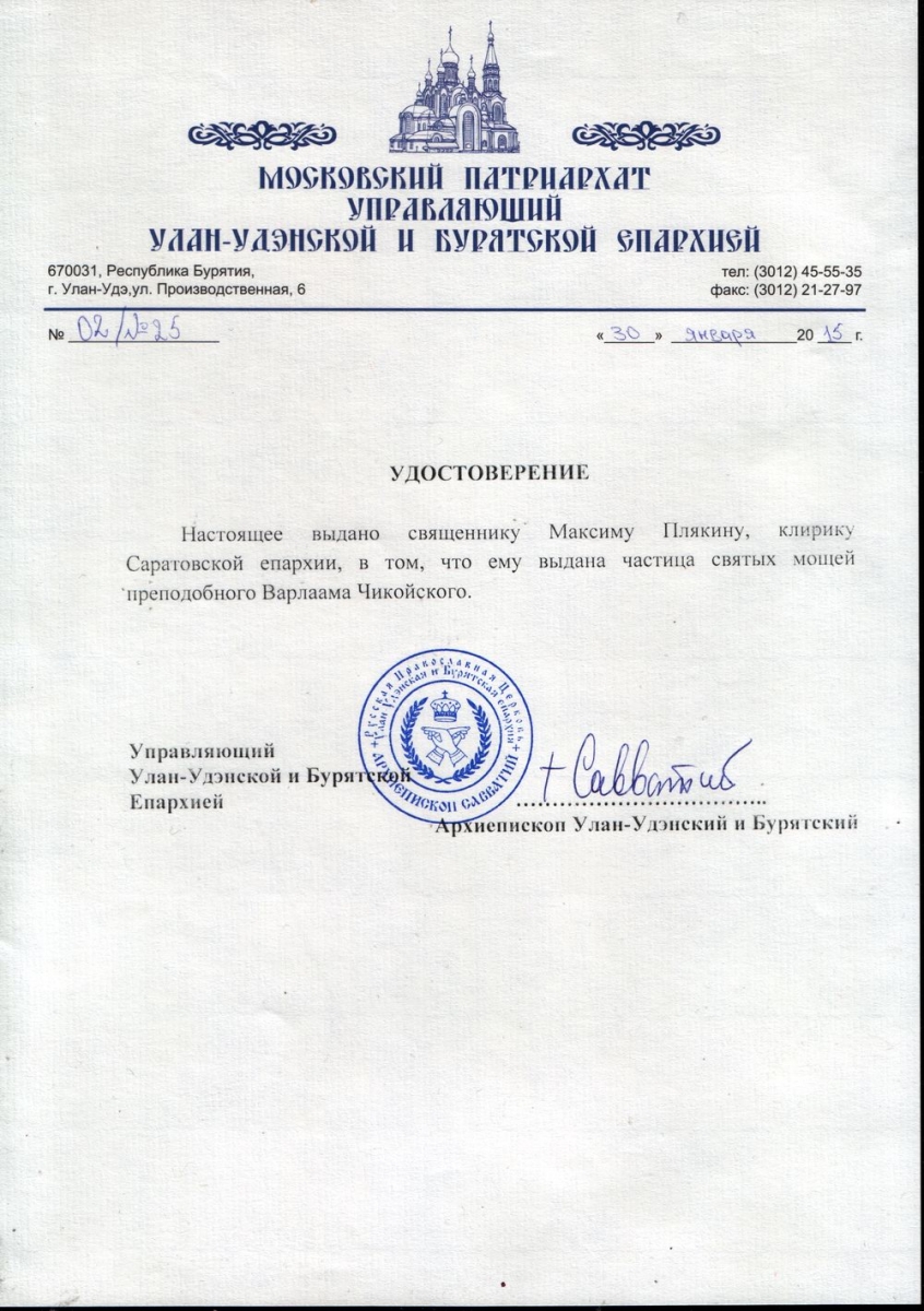 Частица мощей прп. Варлаама выдана священнику Максиму Плякину Высокопреосвященным Савватием, архиепископом Улан-Удэнским и Бурятским, и передана нашему храму.