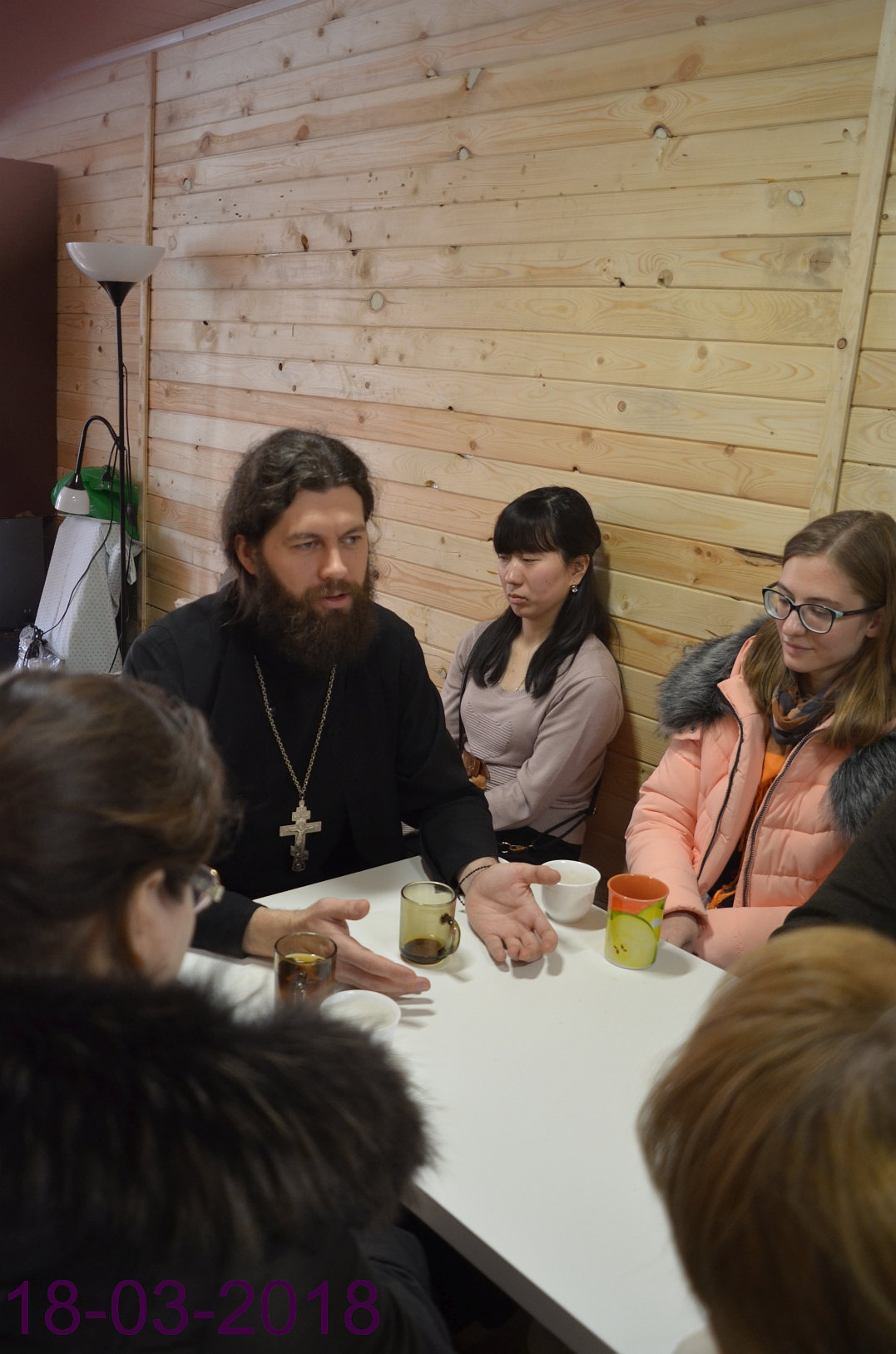 На встрече 18 марта наша молодежь в уютной атмосфере молодежного домика за чашкой чая побеседовала с батюшкой Алексием на волнующие их темы.