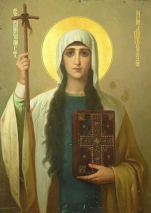 Слова Божия служительнице, во апостольстей проповеди первозванному Андрею и прочым Апостолом подражавшая, просветительнице Иверии, и Духа Святаго цевнице, святая равноапостольная Нино, моли Христа Бога спастися душам нашым. (Тропарь святой Нине)