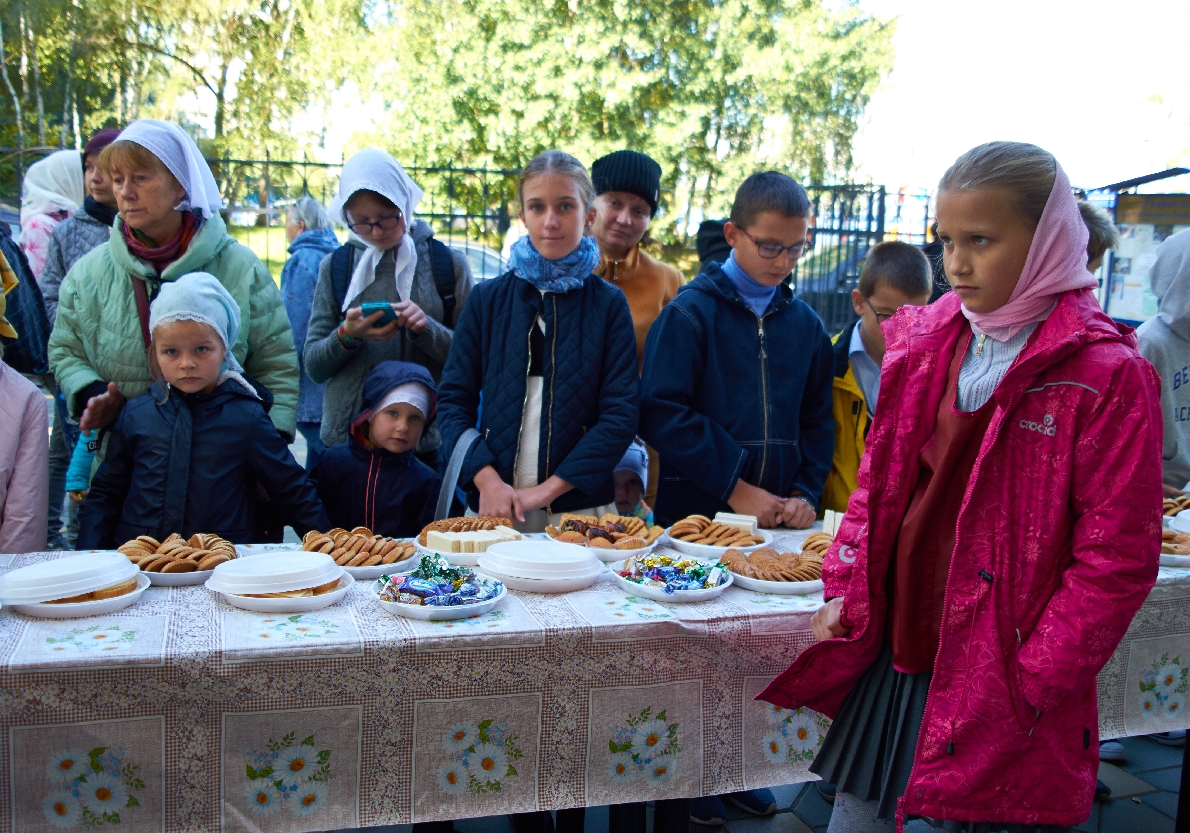 Уже было объявлено до службы, что все приглашены на трапезу. Сладости, бутерброды, каша с фруктами. Угощайтесь!
