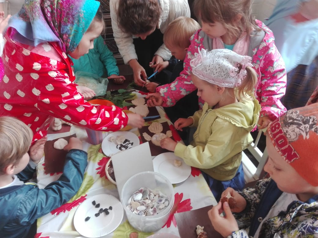 На паперти верхнего храма, расставлены столы с угощением. Как всегда, традиционная каша с фруктами. Прячемся под крышу, а на крыльце правого предела организован мастер- класс для малышей. Лепим из солёного теста, украшаем ракушками, семенами, каштанами и др. природными материалами.