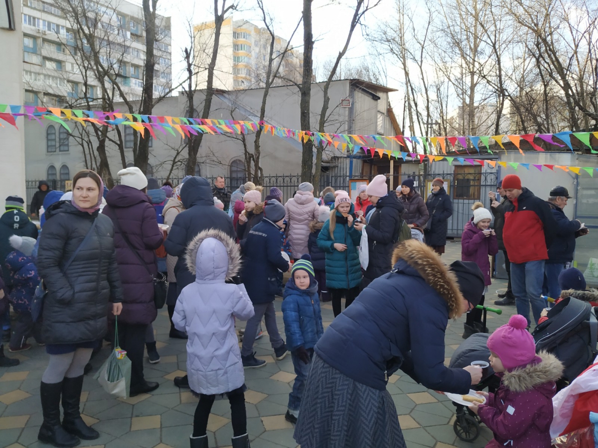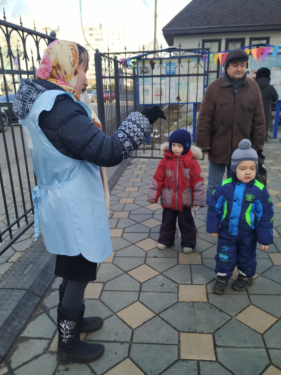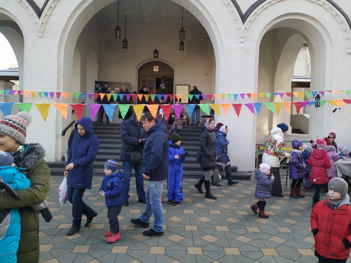 После Литургии детей угощали вкусной кашей, блинами с разнообразными начинками и чаем. После эт трапезы, сотрудница группы "Первые шаги", Елена Солодухинаэтого с малышами водиха хороводы и играла.