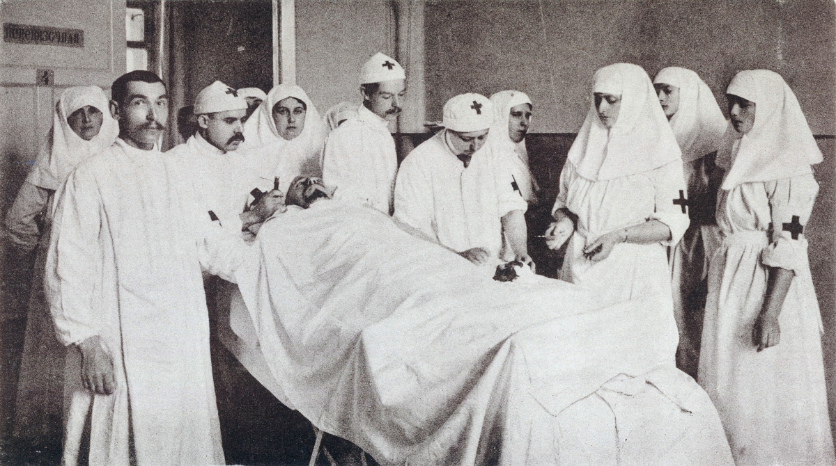 Царскосельский Дворцовый госпиталь. У операционного стола хирург В. И. Гедройц (оперирует), Императрица Александра Федоровна (подает инструменты), Великие Княжны Ольга и Татьяна (стоят позади императрицы). 1914 год. Фото commons.m.wikimedia.org