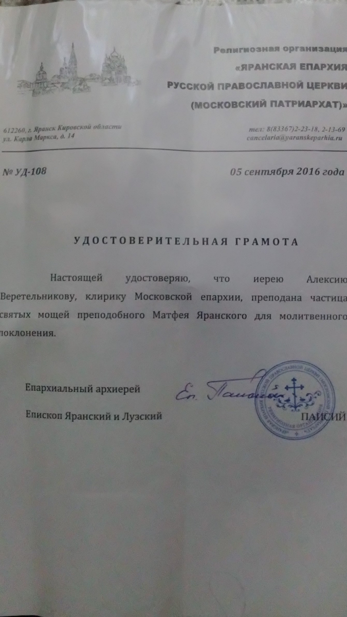 Два года назад, в пятницу 21 августа 2015 года, по благословению Святейшего Патриарха Московского и всея Руси Кирилла в городе Яранске были обретены мощи преподобного Матфея Яранского.