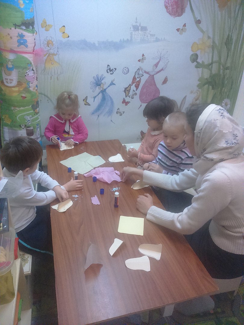 После молитвы «Царю Небесный», принимаемся за поделки: каждому свой колокольчик. Из заготовленных шаблонов склеиваем как лепестки цветка три его части и украшаем блёстками и шариками из цветных салфеток.