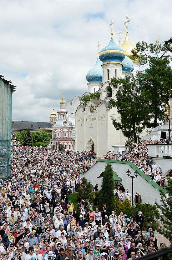 В воскресенье в Лавру приехал Святейший Патриарх Кирилл, этот момент тоже пропустить не хотелось. Патриарх возглавил торжества в Троице-Сергиевой лавре, посвященные празднованию Пресвятой Троицы. В Успенском соборе Лавры, украшенном березками и цветами, Святейший совершил позднюю Литургию, а затем Великую вечерню с чтением коленопреклоненных молитв о даровании Святого Духа. А потом со словом пастыря он обратился к присутствующим с балкона Патриарших палат. Вся территория от Патриарших палат до Успенского собора была заполнена народом.