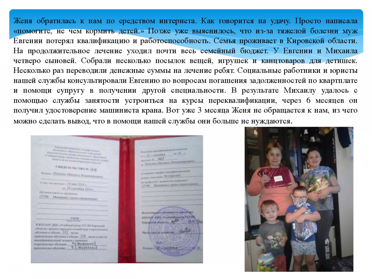 Жене, помимо материальной помощи, помогли связать и научить взаимодействовать с местными соцработниками в Кировской области. В последнее время она уже не обращается в наш Храм за помощью. Надеемся, что необходимость в ней отпала.