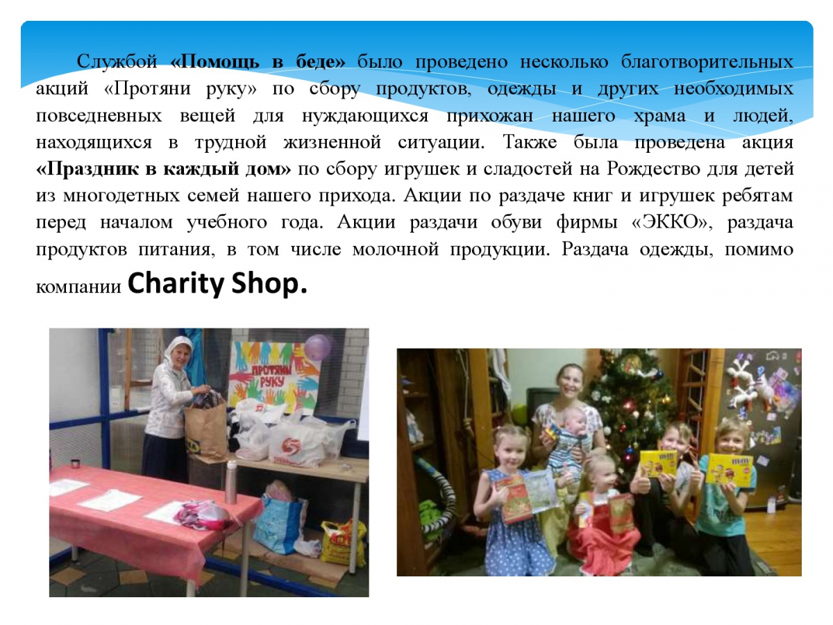 б) Акция "Праздник в каждый дом" по сбору и раздаче подарков детишкам наших нуждающихся прихожан на Большие Праздники. Ближайшая акция пройдет 15 декабря и в ней сильно требуется помощь добровольцев, особенно по упаковке подарков.