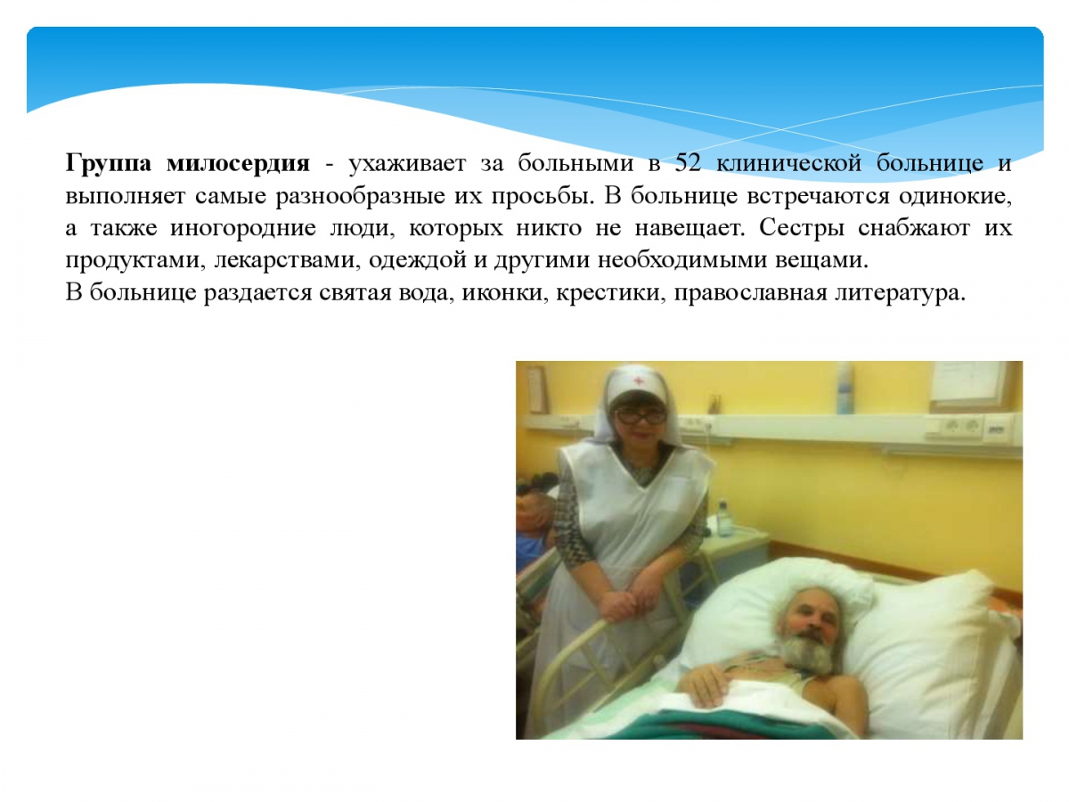 Основное служение группы Милосердие проходит в больнице №52. На этом направлении постоянно требуется помощь добровольцев. Каждому добровольцу найдется служение по его силам.