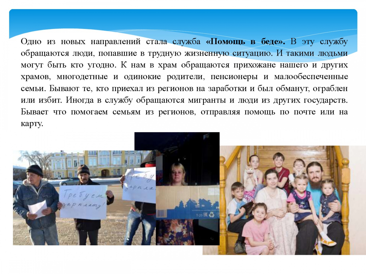 г) Раздача продуктов от фонда продовольствия "Русь". Особенностью этих раздач является то, что нам в Храм привозят большой объем продуктов, который очень срочно (если это йогурты, то в течение одного-двух дней) необходимо раздать, соблюдая при этом строгую отчетность. На этом направлении очень требуется помощь добровольце как на самой раздаче, так и для обзвона и оповещения наших просителей о предстоящей раздаче.