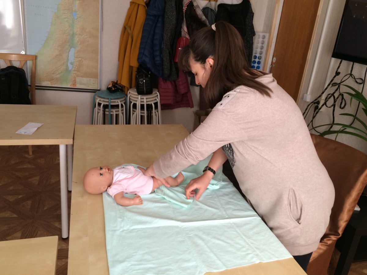 На рынке детских товаров существует множество подгузников, как выбрать то, что нужно, и как одеть ребенку марлевый многоразовый подгузник -этому мы учились вместе. Были продемонстрированы необходимые предметы, которые должны быть в аптечке для малыша. Будущие мамы наглядно все увидели, потрогали и взяли на заметку.