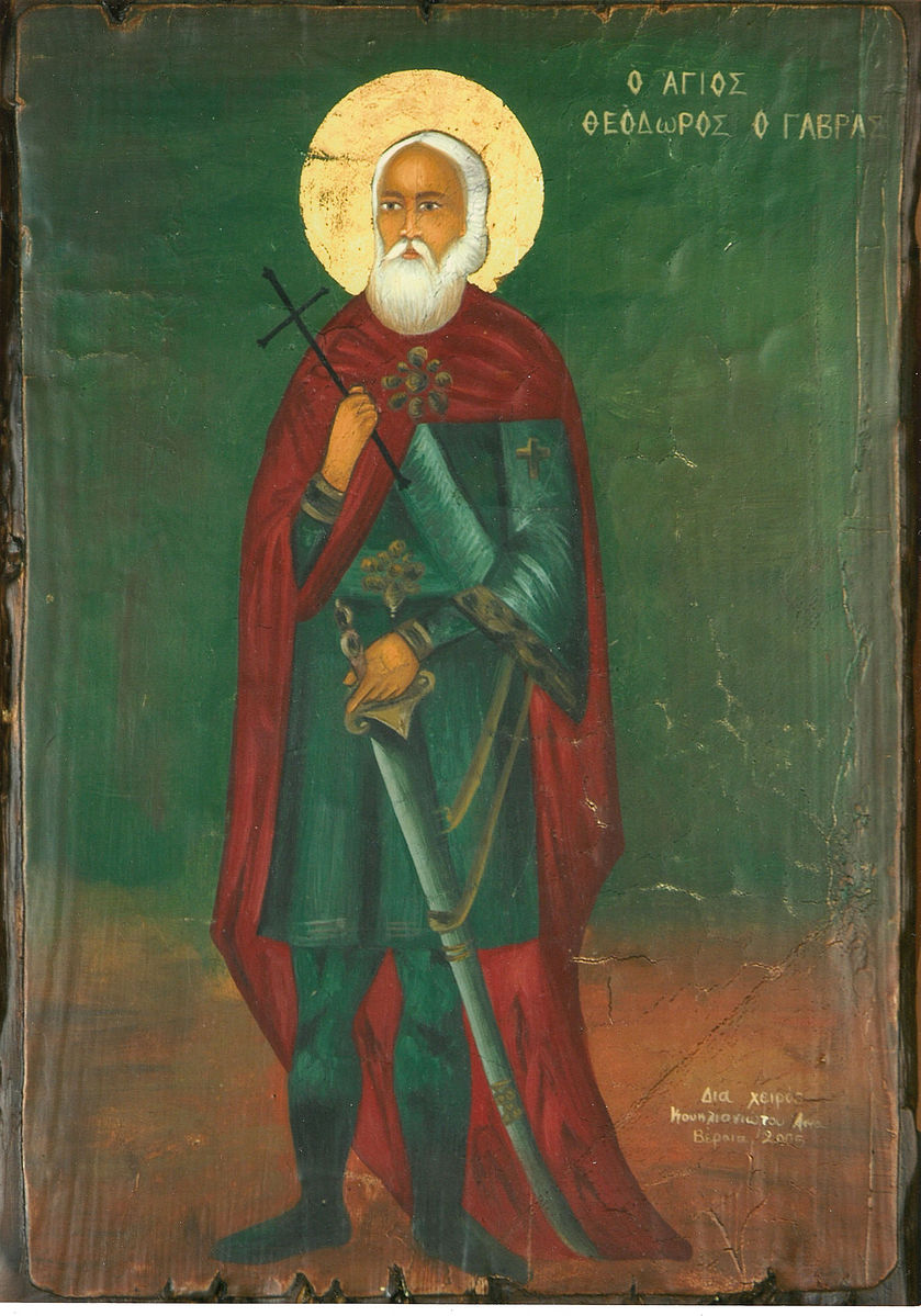 На миниатюре Синайской рукописи XI века имеется изображение Иисуса Христа, возложившего руку на голову воина. Надпись гласит: «Феодор Гаврас, патрикий, раб Христов». Симметрично этому изображению на соседнем листе той же рукописи помещено изображение супруги святого Феодора Гавраса – Ирины Таронит, благословляемой Богородицей.
