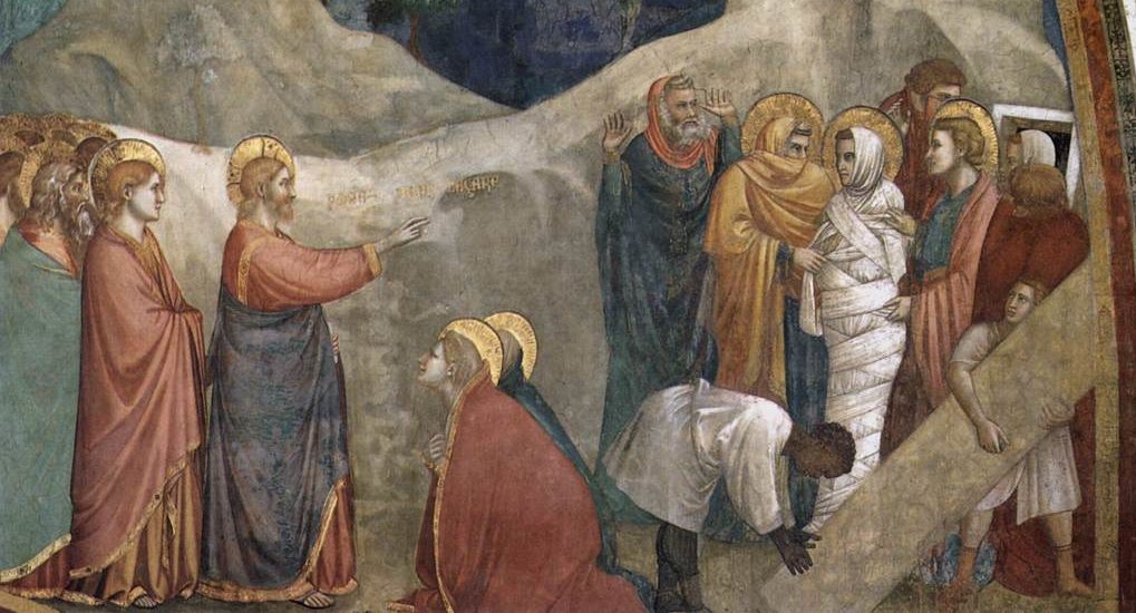 И вышел умерший, обвитый по рукам и ногам погребальными пеленами, и лицо его обвязано было платком. Иисус говорит им: «Развяжите его, пусть идет». Тогда многие из иудеев, пришедших к Марии и видевших, чтó сотворил Иисус, уверовали в Него.