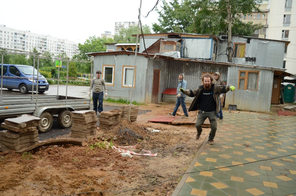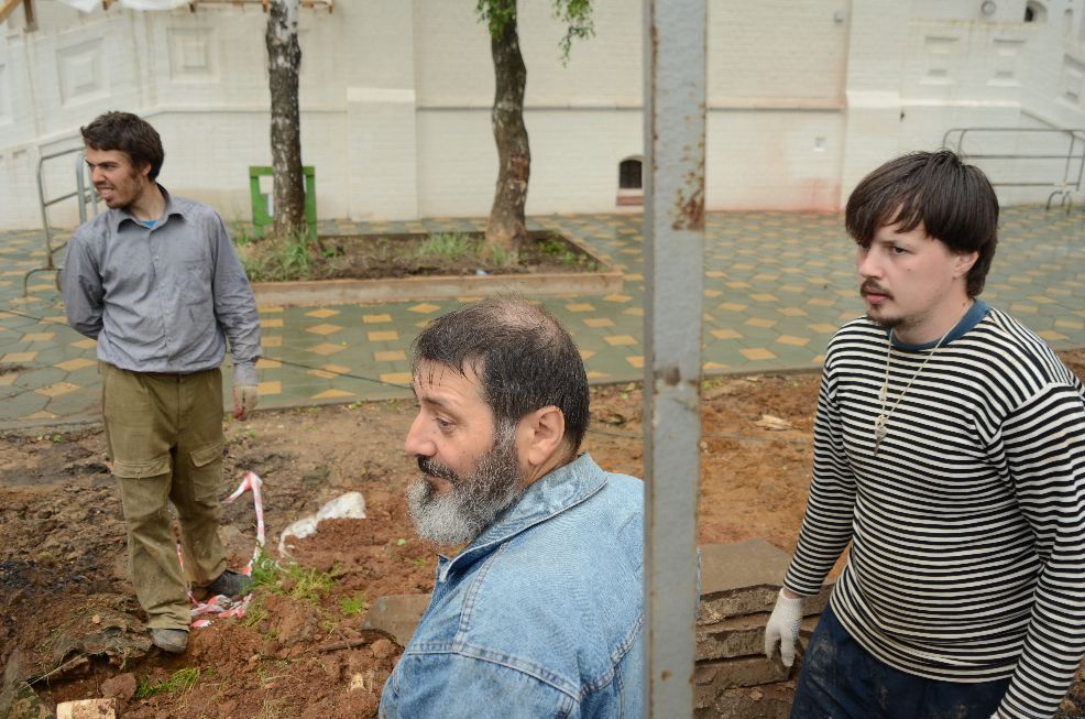 Также было дело связанное с плитками и подведомственное Валерию Васильевичу. Если помните, вокруг нашего храма дорожки были выложены плиткой. Это были камни весом от 15 до 50 кг в количестве не менее 200. Их посчитали потому, что каждый, кто приходил их выковыривать или загружать их в прицеп – сами, понимаете, сколько усилий тратил на каждую. В этом длительном, растянувшемся на полтора месяца мероприятии участвовало в сумме около 20 здоровых и уже не очень молодых людей и мужчин. Последнее шутка, так как все обошлось благополучно - пострадавших от плитки нет. Чаще всего руководил этим процессом алтарник Филипп Ярош. Плитку возили поштучно на тележке для газовых баллонов, складывали в штабели, грузили в прицеп, разгружали из прицепа на стройке. И даже заложили этой плиткой по недосмотру купель, поставленную у склада. Какая-то инженерная мысль наших прихожан потом вынула-таки эту купель из-за штабелей с плиткой. Было боязно смотреть на некрепких юношей с трамвайной плиткой в руках. Например, Николай, очень юный с виду молодой человек помогал загружать плитку вместе с отцом.