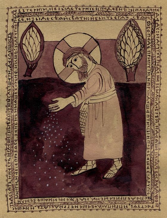 КОГДА НАСТАНЕТ СКОРБЬ ИЛИ ГОНЕНИЕ ЗА СЛОВО, когда настанет нужда пострадать за веру, он ТОТЧАС СОБЛАЗНЯЕТСЯ, как будто с ним случилось что-либо странное, неожиданное, падает духом и гибнет от зноя искушений, как растение без корня – от палящих лучей солнца. А ПОСЕЯННОЕ В ТЕРНИИ ОЗНАЧАЕТ ТОГО, КТО СЛЫШИТ СЛОВО, принимает его, но вместе со словом спасения открывает свое сердце и для земных грешных забот о житейских делах и удовольствиях; НО ЗАБОТА ВЕКА СЕГО, эта чрезмерная забота о том, чтобы не умереть с голоду, без веры в Промысл Божий, пекущийся о человеке, И ОБОЛЬЩЕНИЯ БОГАТСТВА, все то, чем обольщает человека мир с его соблазнами, что дает пищу человеческому тщеславию, что возбуждает в нем греховные страсти, все это ЗАГЛУШАЕТ в его сердце СЛОВО, благодатное семя спасительной истины. Сердце такого человека как бы раздваивается; его влечет к себе и слово Божие, но ему жаль совсем расстаться и с земными удовольствиями; он пытается помирить в своем сердце то и другое, хочет служить и Богу и маммоне, но это невозможно; и вот, земные заботы и соблазны совсем овладевают его сердцем, и благодатные семена заглушаются их тернием, всякое духовное желание замирает, душа холодеет к добру, И доброе семя слова Божия не приносит в нем плода, ОНО БЫВАЕТ БЕЗПЛОДНО. ПОСЕЯННОЕ ЖЕ НА ДОБРОЙ ЗЕМЛЕ ОЗНАЧАЕТ СЛЫШАЩЕГО СЛОВО И РАЗУМЕЮЩЕГО, означает того, кто со всем усердием усваивает умом и сердцем святую истину и хранит ее в добром и чистом сердце. Такой человек не будет раздваиваться сердцем, он желает вырвать с корнем все греховные пожелания, глубоко таящиеся в сердце; он внимательно смотрит в свое сердце и готов каждую минуту подавить в нем всякое сочувствие ко всему греховному, как бы это ни было ему больно. В таком человеке слово спасения находит себе добрую почву, пускает свои благодатные корни в глубину его сердца и делает его плодоносным; КОТОРЫЙ И БЫВАЕТ ПЛОДОНОСЕН, ТАК ЧТО ИНОЙ ПРИНОСИТ ПЛОД, смотря по ревности каждого человека, по его силам и способностям, ВО СТО КРАТ, ИНОЙ В ШЕСТЬДЕСЯТ, А ИНОЙ В ТРИДЦАТЬ. Так объясняет притчу о семени Сам Божественный Сеятель. Он показывает в этой притче, что Бог спасает человека не без участия самого человека; Бог влагает в его сердце Свое животворящее благодатное слово, а человек должен открыть свое сердце для этого святого семени и очистить сердце от всякой нечистоты. От Бога – сила благодати, от человека – стремление к Богу всем сердцем. Есть греховные навыки, которые подобно терниям и волчцам заглушают в душе всякое доброе пожелание, но нет греха, побеждающего Божие милосердие: семя Небесное тем и отличается от земного, что может могущественно действовать на ту почву, на которую упало, – на сердце, смягчая его и углубляясь в него, исторгая в нем самые корни зла, если только человек дает ему свободу действовать там, если сам не питает в своем сердце терний и волчцов греховных похотении.