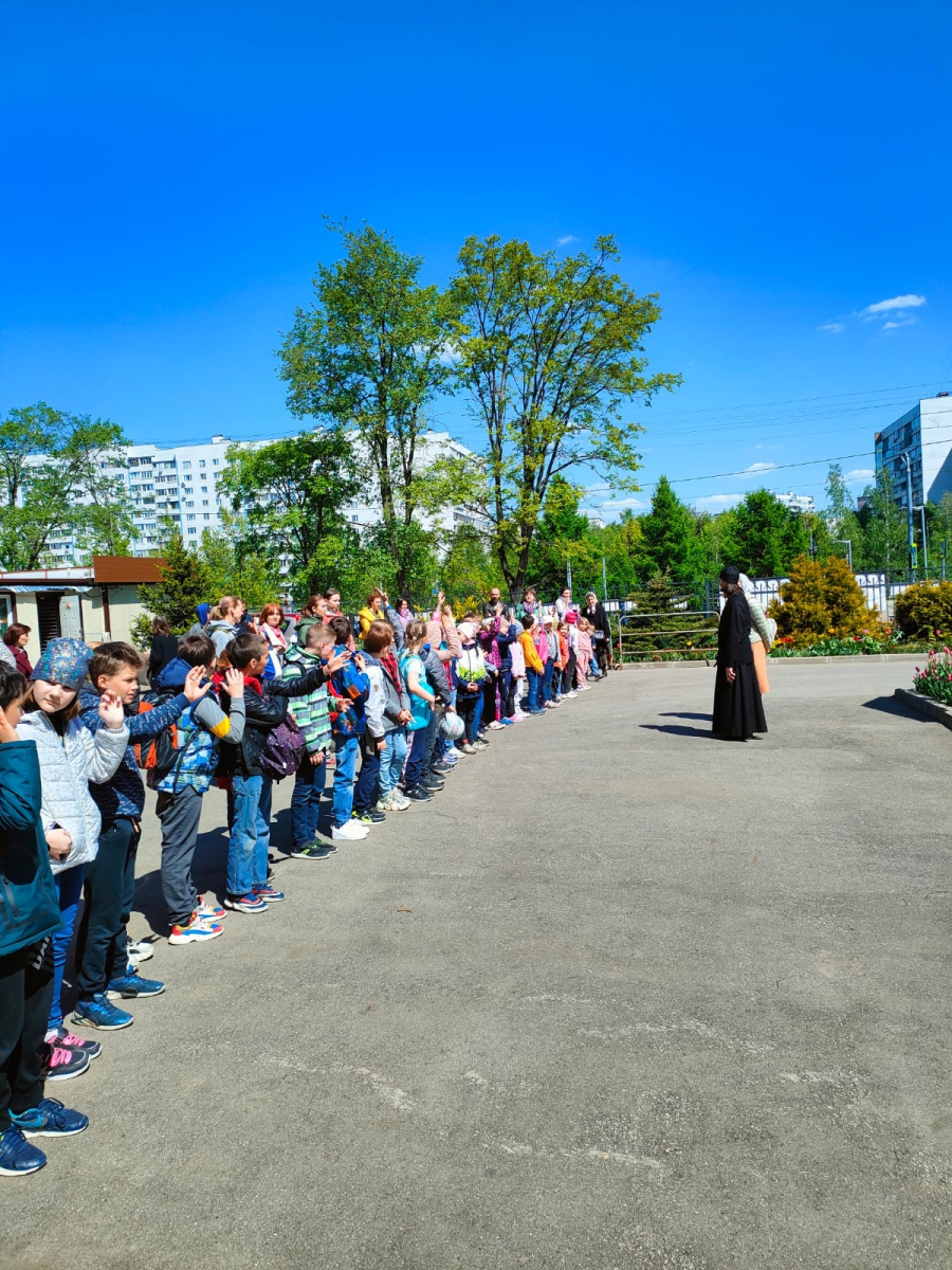 После построениея и совместной молитвы у храма - группа преподавателей, детей и родителей отправились пешком от храма на Строгинский остров.
