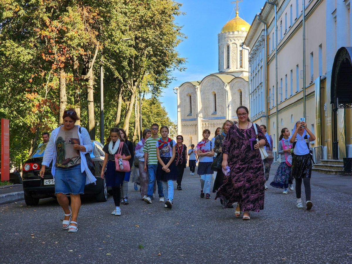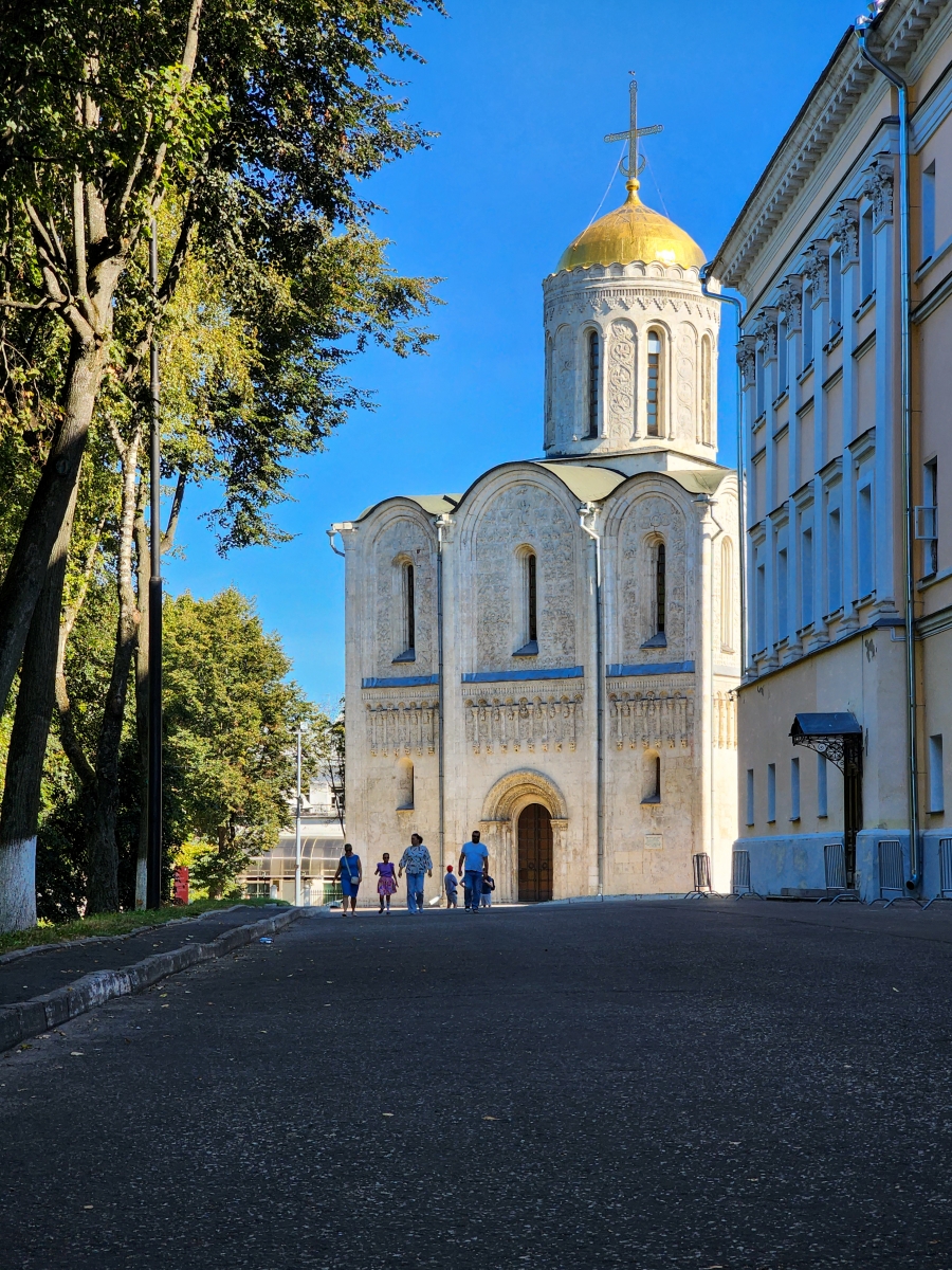Знакомство с городом началось с Соборной площади, где нас встретила прекрасный экскурсовод Наталья Евгеньевна, которая увлекательно, с глубоким знанием истории познакомила с происхождением Успенского и Дмитриевского соборов, храмами и памятниками Георгиевской улицы - «Владимирского Арбата».
