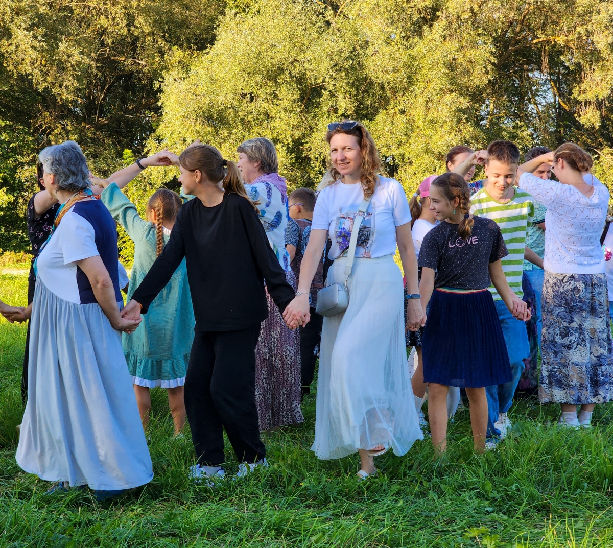 На обратном пути на просторах Боголюбских лугов Ольга Дмитриевна Стельмах провела для нас фольклорные игры. Мы водили хороводы, пели, бегали, прыгали на одной ноге! Повеселились от души!