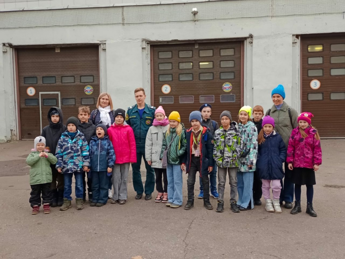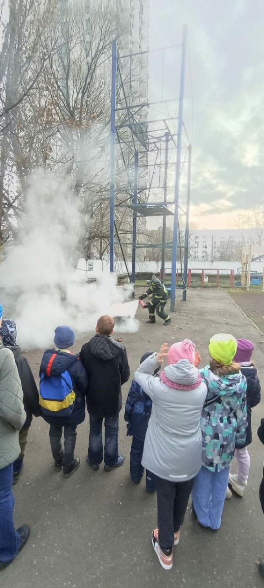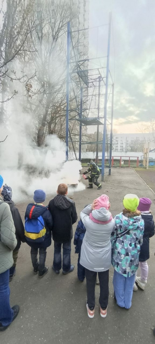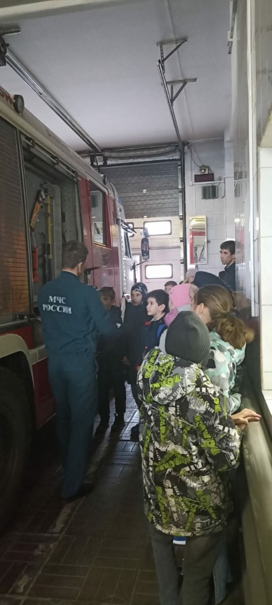 Ребятам показали помещения пожарной части, инвентарь для тушения пожара, экипировку поражного, гараж с пожарной машиной, организовали бочку для поджига, и показали как в полном обмундировании тушить пожар с помощью огнетушителя.