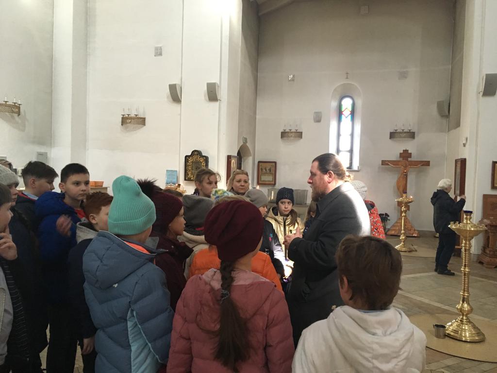 Историю храма, его архитектурные особенности, внутреннее устройство рассказал иерей Илья Шелаев, вместе с учениками и классным руководителем Роговой Ириной Сергеевна, поднялись на хоры, где открывается прекрасный вид на убранство храма и поговорили о иконостасе, его назначении и символизме иконописная.