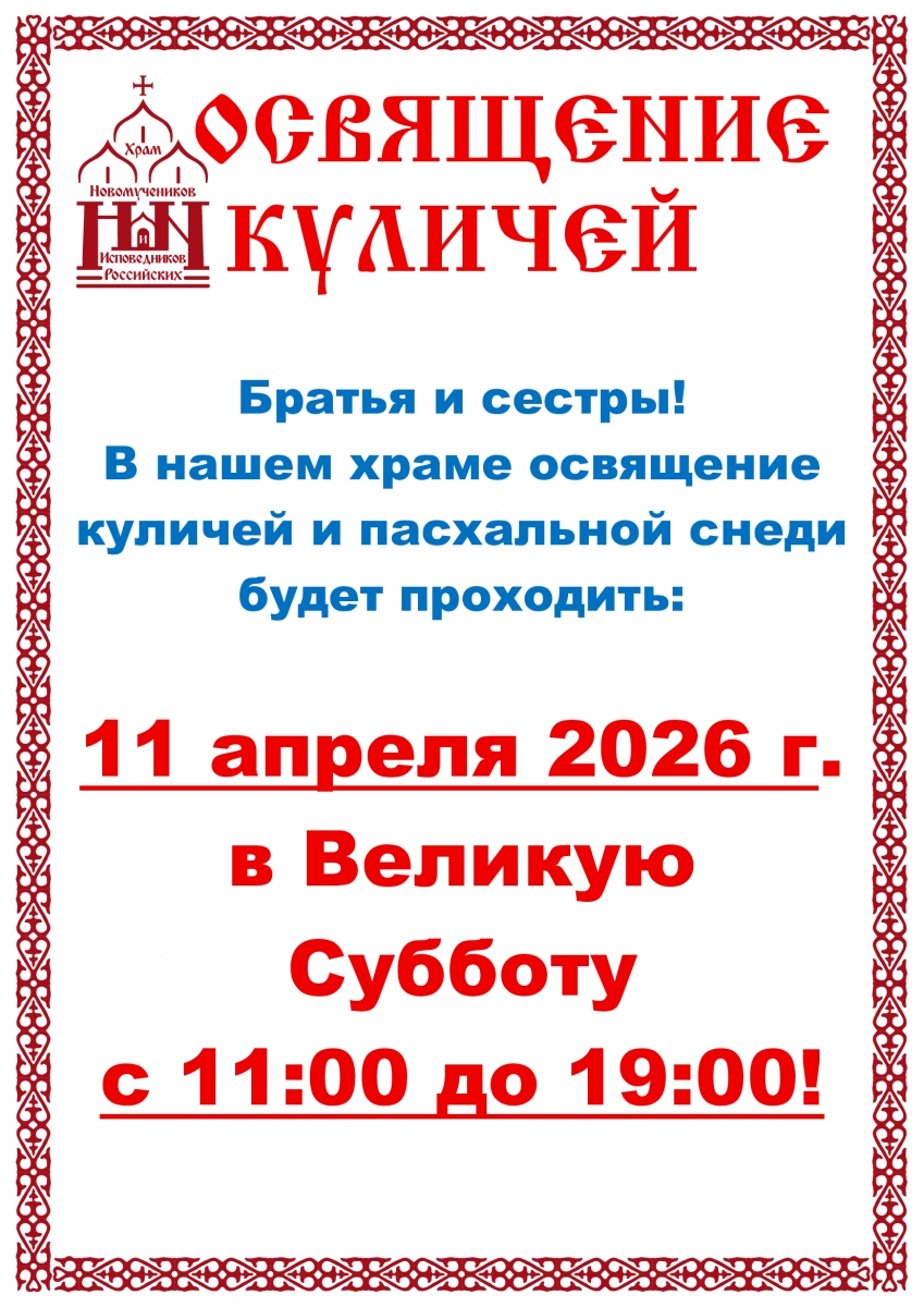 11 апреля 2026 г. в Великую Субботу с 11:00 до 19:00!