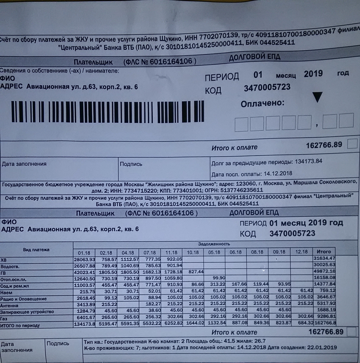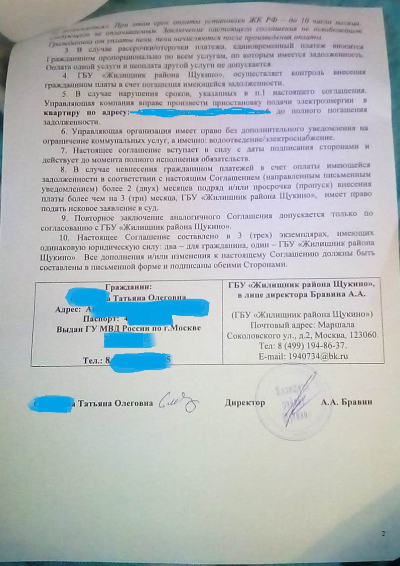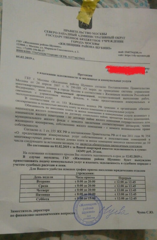 Уже после публикации просьбы о помощи в покупке электросчетчика на имя Татьяны пришла претензия из ГБУ Жилищник района Щукино. Где говорилось о том, что в связи с просрочкой платежей по долговому соглашению и с задолженностью более 140 000, при неоплате долга поступление коммунальных услуг могут быть прекращены. Работники социальной службы с благословения руководителя о. Алексея приняли решение разобраться в этом вопросе, дабы не оставить малолетних детей без воды и света. В связи, с чем был нанесен визит в ГБУ Жилищник и вот что удалось узнать. По состоянию на 1 февраля 2019 долг составлял более 160 000 (эта задолженность образовалась достаточно давно, когда еще первый Танин муж тяжело болел и они не жили в этой квартире. В квартире жил и проживает до сих пор главный квартиросъемщик и сосед Татьяны, инвалид – он категорически не платил долгое время и теперь Таня гасит долги самостоятельно. Связываться по судам она не хочет на то есть причины. Все Татьяна может рассказать при знакомстве, если кому-то будет интересно). Ситуация на данный момент такова: