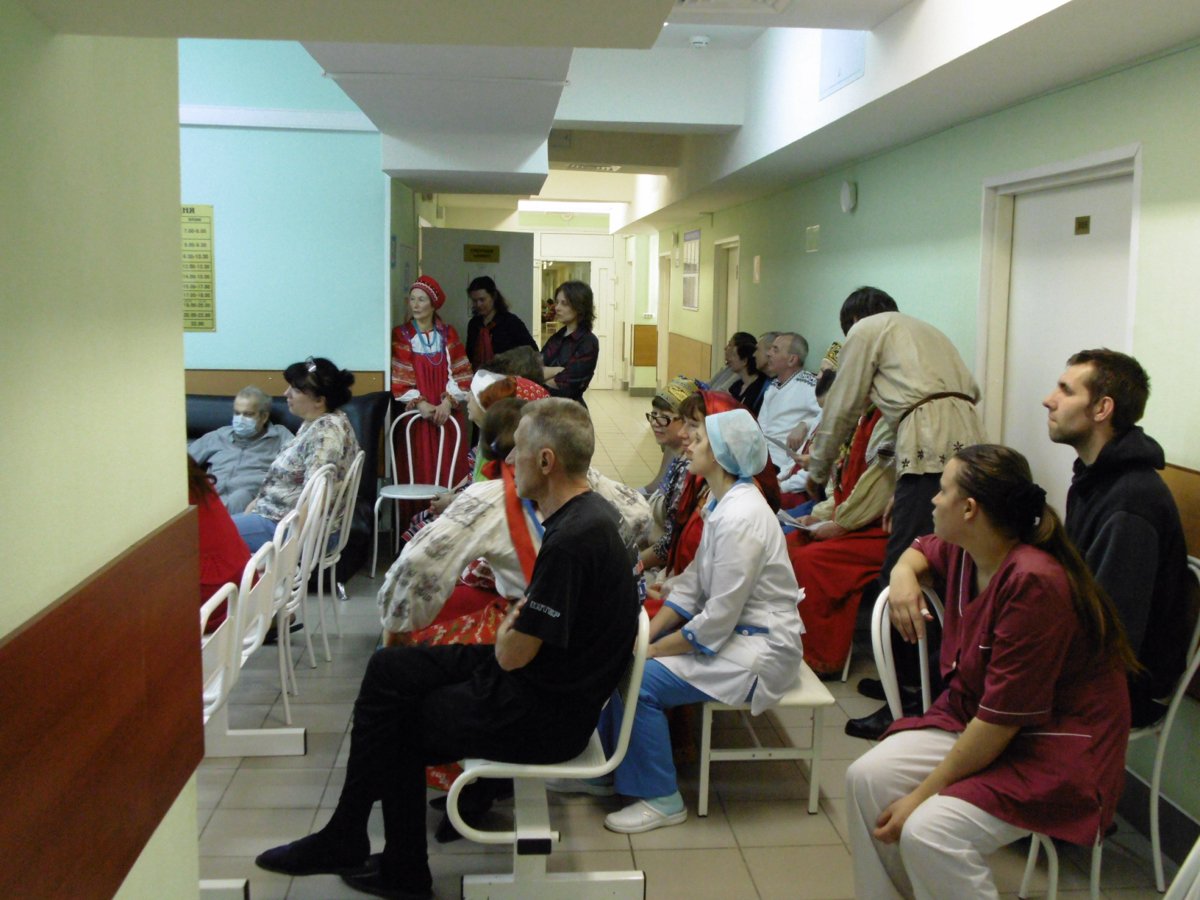В этот день группа милосердия провела два концерта в разных корпусах больницы. В зале, в который превратилась больничная столовая, было много зрителей. Хор, под управлением Анны Демиденко, в ярких народных костюмах пел волочебные песни и исполнял стихиры Пасхи. Волочебные христославные песни это своего рода пасхальные калядки, прославляющие Христа и его непостижимое Воскресение, которые содержат также приветствие и благопожелания хозяевам дома, куда зашли волочебники.