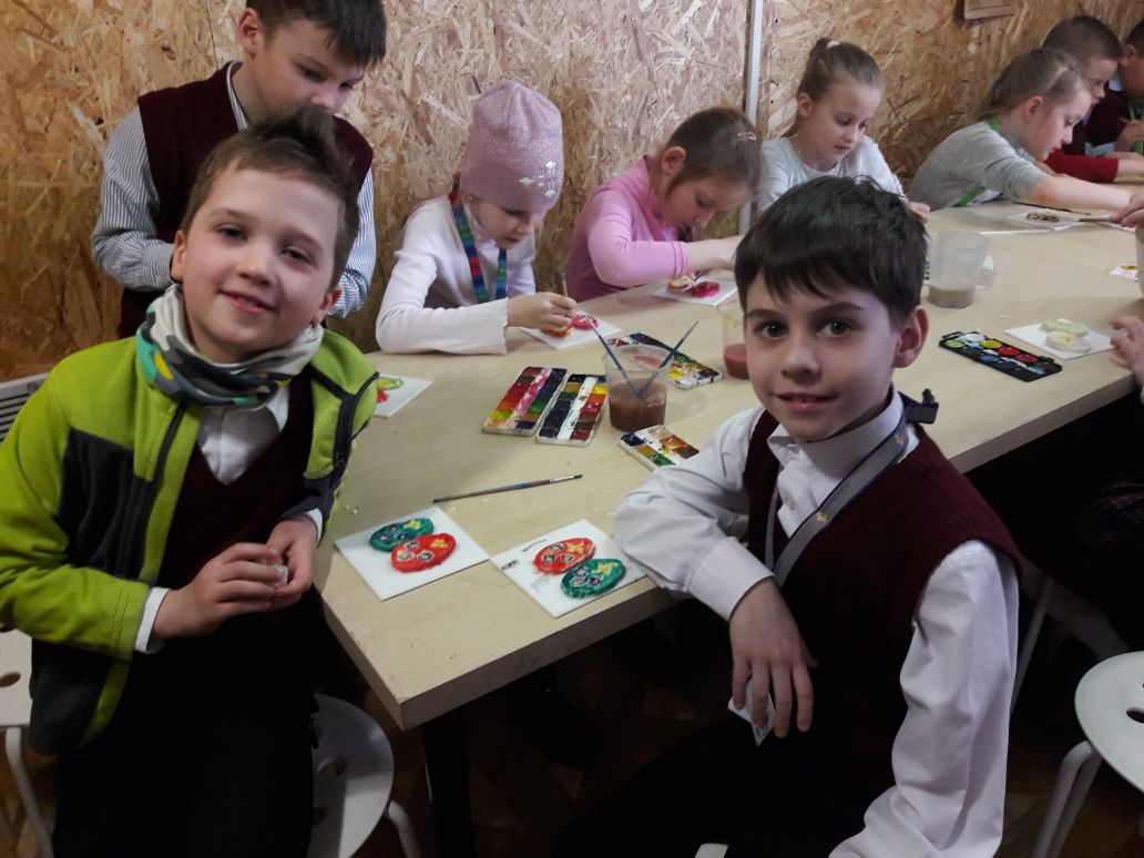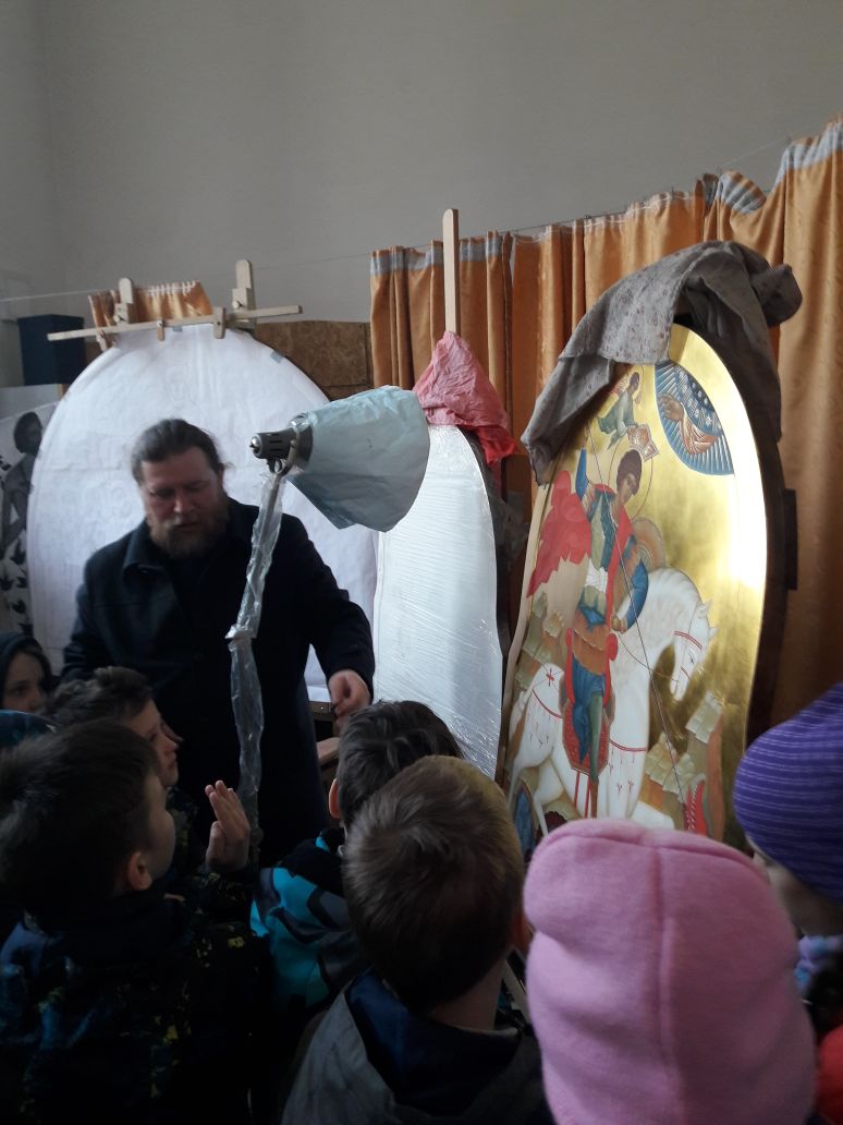 Далее группа проследовала в верхний храм, зашла в иконописную мастерскую, где увидела весь трудоемкий процесс написания икон. Подробно и близко детишки рассмотрели икону святого Георгия Победоносца, покровителя Москвы, в том числе животных изображенных на ней. Порассуждали о иконографической символике. О том, что научившись рисовать животных, можно прикоснуться к миру иконописи. Мы узнали, из чего делают настоящие краски и даже посмотрели баночки с ними.