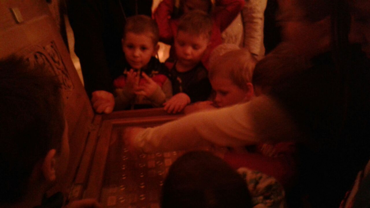 Спустившись в нижний Храм, дети близко увидели и даже потрогали Пасхальное богослужебное облачение священнослужителя. Затем о.Илия вынес большую богослужебную книгу Евангелие и дал каждому посмотреть ее вблизи. И, конечно, тот самый черный ящик как всегда произвел фурор. Из него о.Илия достал точные копии богослужебных сосудов времен великого князя Юрия Долгорукова, хранящиеся в Оружейной Палате, рассказав о назначении каждого предмета.