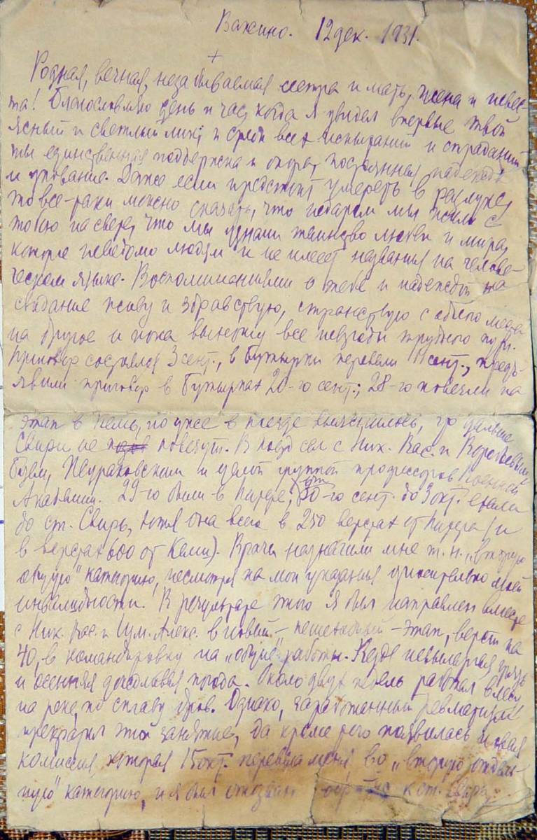 "Родная, вечная, незабываемая сестра и мать, жена и невеста! Благословляю день и час, когда я увидел впервые твой ясный и светлый лик, и среди всех испытаний и страданий ты единственная поддержка и опора, постоянная надежда и упование. Даже если предстоит умереть в разлуке, то все-таки можно сказать, что недаром мы жили с тобою на свете, что мы узнали таинство любви и мира, которое неведомо людям и не имеет названия на человеческом языке. Воспоминаниями о тебе и надеждой на свидание живу и здравствую, странствую с одного места на другое и пока выношу все невзгоды трудного пути. Везде невылазная грязь и осенняя дождливая погода. Около двух недель работал в лесу, на реке, по сплаву дров... Я сторожу дрова на бирже по 8 часов в сутки, разгуливая по реке то днем, то ночью, почти в полном уединении. Дали валенки и кое-что теплое. Я, вопреки мнению большинства знакомых арестантов, придерживаюсь довольно сильного оптимизма – не скрою этого, – хотя многие надо мною смеются..."