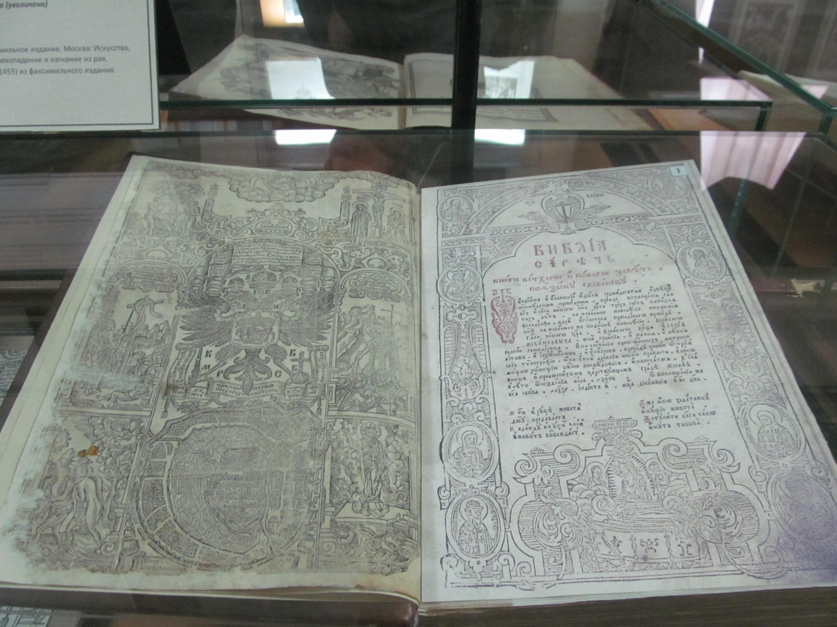 Это и факсимильные издания самых ранних и знаменитых книг Св.Писания (Ассеманиево и Остромирово Евангелие Х-ХI вв., и Сборник Святослава 1073 г.), и оригинальные экземпляры Библии, начиная со знаменитого первого полного славяно-русского издания, напечатанного Иваном Федоровым в 1581 г. на средства князя К.К.Острожского.