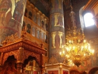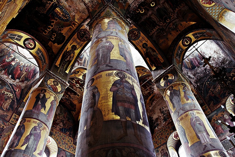 Великолепен Успенский собор - храм на высоком белокаменном подклете с изразцовым фризом «павлинье око» работы Степана Полубеса. Сейчас его купола, кроме центрального, закрыты, идет их золочение. Росписи интерьера выполнены в 1904 году палехскими мастерами, расписавшими храм яркими красками то по золотому, то по темно серому фону в палехском стиле. Мы посетили Успенский собор, осмотрели его, заказали требы, помолились и приложились к иконам, поставили свечи. С благоговением приложились к мощам преподобного Иосифа Волоцкого и деревянному киоту, где хранятся его вериги. Это массивные металлические цепи, кресты и пластины, которые преподобный Иосиф носил под одеждой, не снимая, а обнаружили их после смерти, когда тело готовили к погребению.