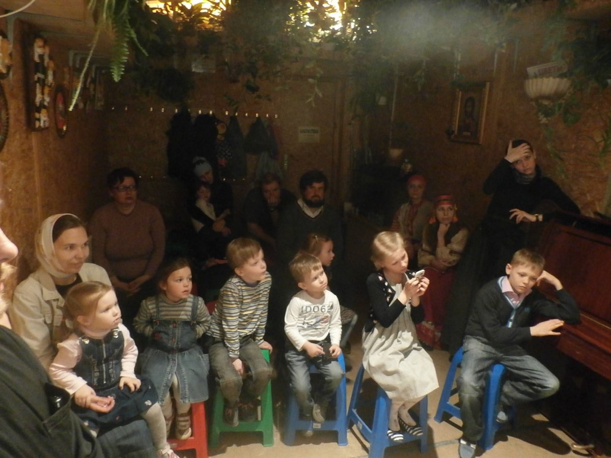 Взрослую группу поздравил настоятель храма протоиерей Георгий Крылов. Также он рассказал о ходе стоительства нашего храма, с просьбой поддрержать строительство храма на улице Исаковского. Для взрослой группы воскресной школы был показан документальный фильм "Пасха 1945". Фильм роли церкви в Великой Отечественной войне, роль веры для человека на полях сражений, в эти трудые годы. И, конечно, эта тема не может не волновать верующил людей, особенно в наше время оскудения веры и любви.