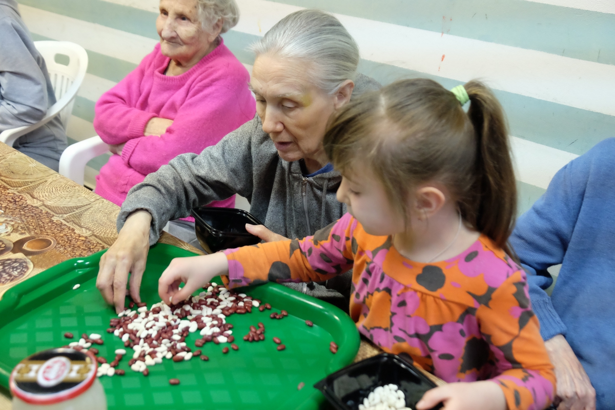 Кто-то готовил открытки с поздравлениями для дедушек, кто-то участвовал в конкурсах. Так Тамара Михайловна и Настюша разбирали перемешанную "нерадивой кухаркой" красную и белую фасоль. Делали они это вместе, руками, раскладывая по определенным баночкам. Так и передавалось тепло рук, а вместе с ним навыки и опыт. Тамара Михайловна учила Настю, как быстрей выбрать фасоль нужного цвета. И не зря торопила, потому что они соревновались с Татьяной Петровной и Ксюшей. В итоге победила дружба))) Все хозяйки и помощницы выполнили задание быстро. Тут же рядом, участница кино-клуба "Единение" выпекала блины на небольшой блиннице.