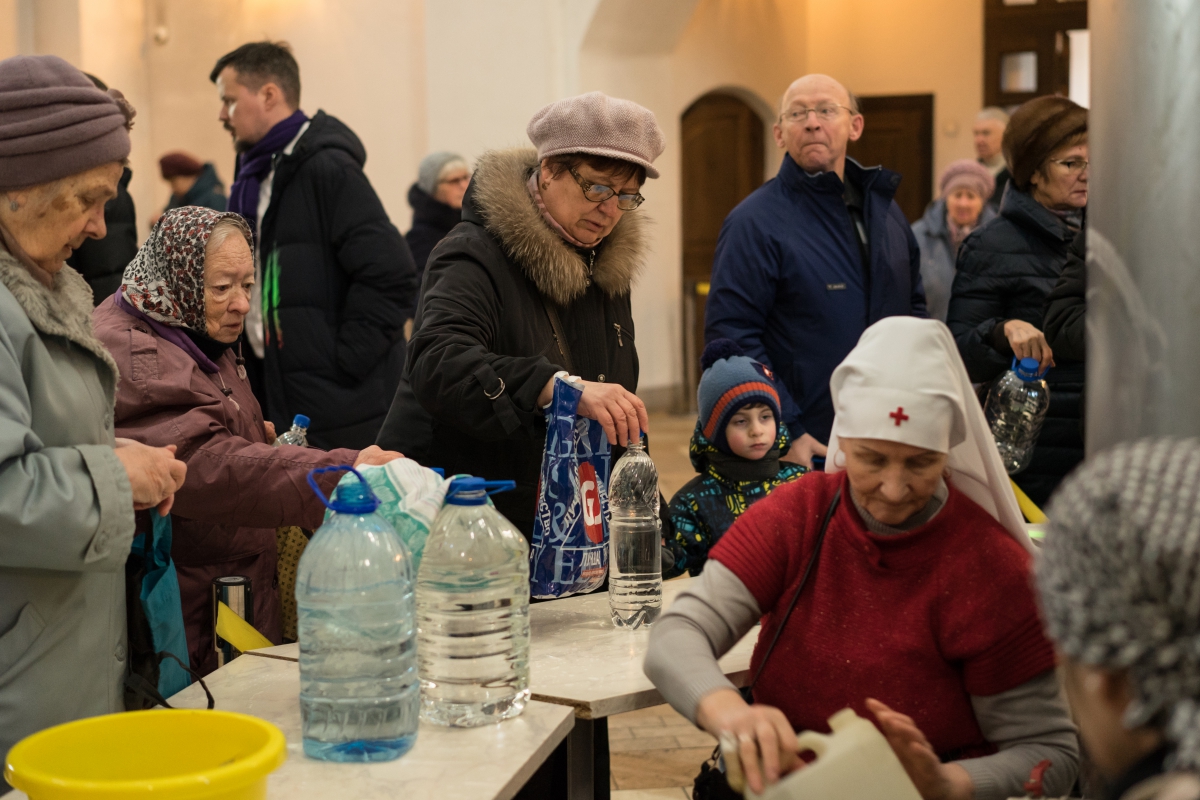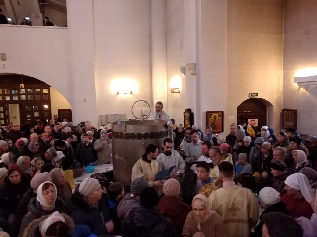 После Богослужения состоялся чин Великого освящения воды в трех местах (в верхнем и нижнем храмах и в крестильной - для маломобильных граждан). В каждом из этих мест верующие могли в течении дня набрать Агиасму.