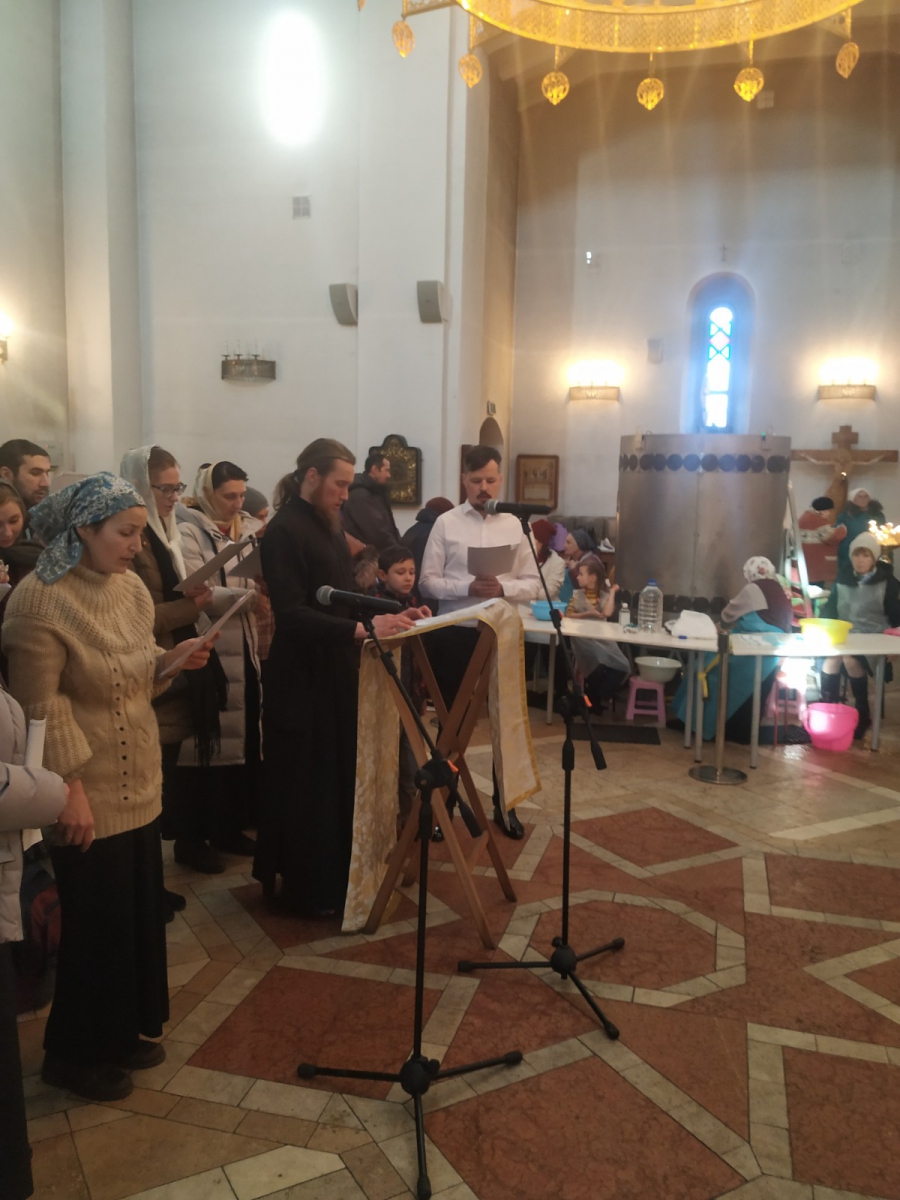 18 января утром состоялось торжественное Богослужение, состоявшее из Литургии свт. Иоанна Златоуста в соединении с Вечерней, на которой читалось 12 празднечных паремий (пророчеств о Крещении Господни). Здесь можно посмотреть небольшой отрывок этой службы.
