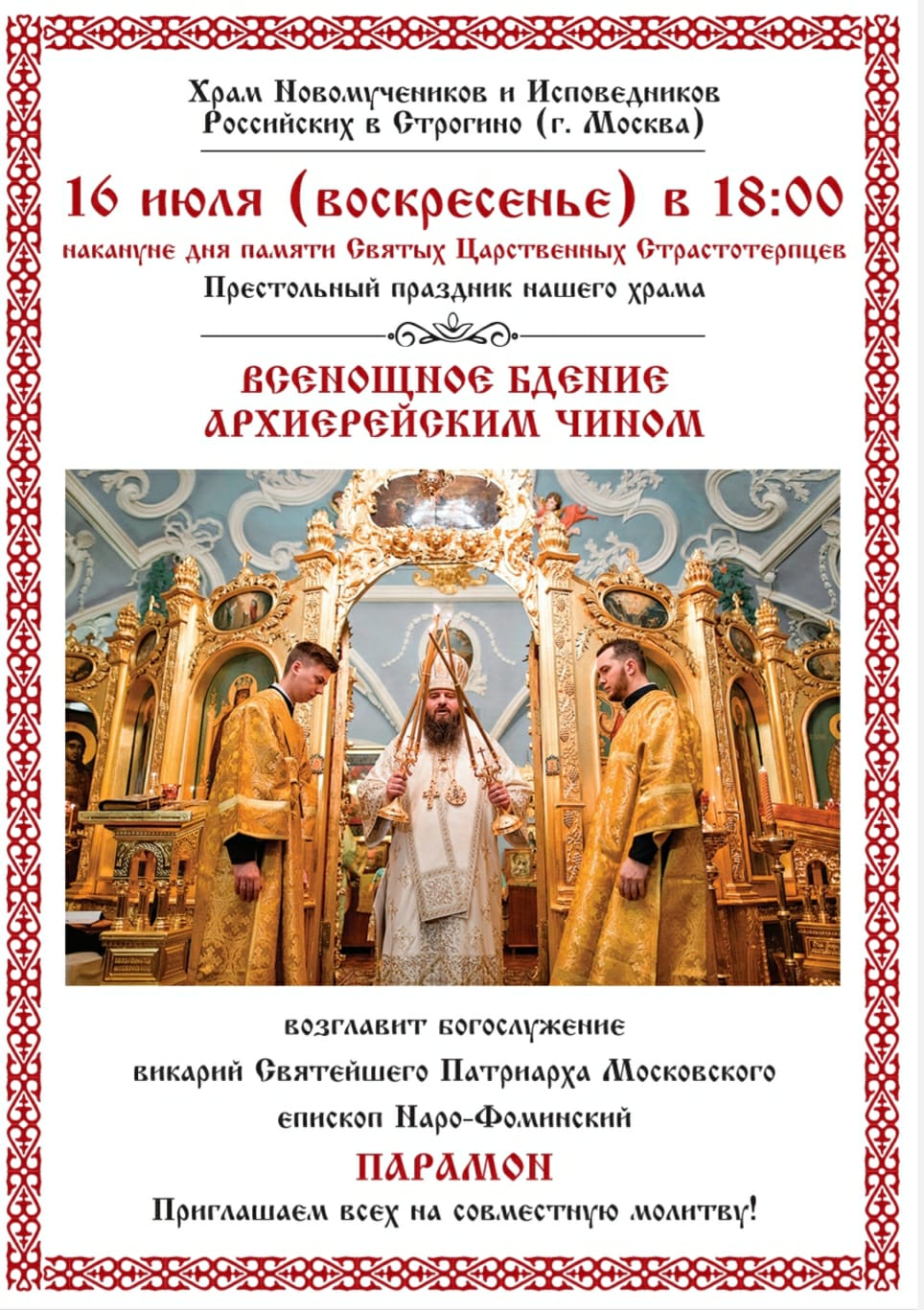16 июля (воскресенье!) в 18:00 накануне дня памяти Святых Царственных Страстотерпцев