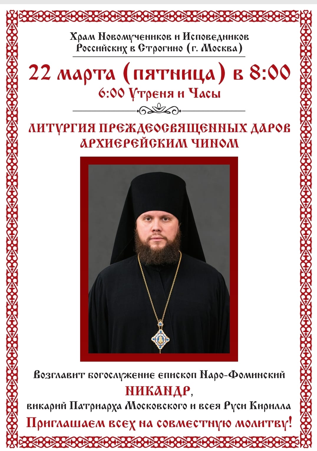 будет ЛИТУРГИЯ ПРЕЖДЕОСВЯЩЕННЫХ ДАРОВ АРХИЕРЕЙСКИМ ЧИНОМ