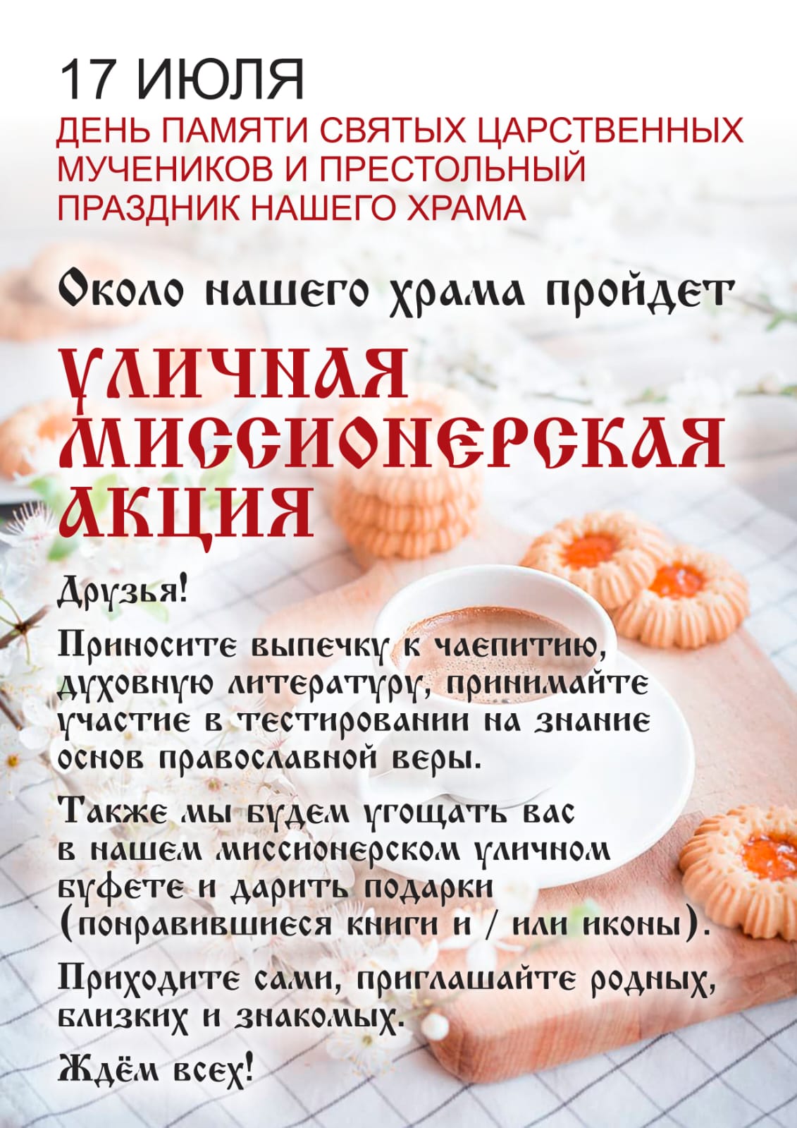 В этот день в 13:30, ждём всех вас на УЛИЧНОЙ МИССИОНЕРСКОЙ АКЦИИ, которая пройдёт около территории храма.