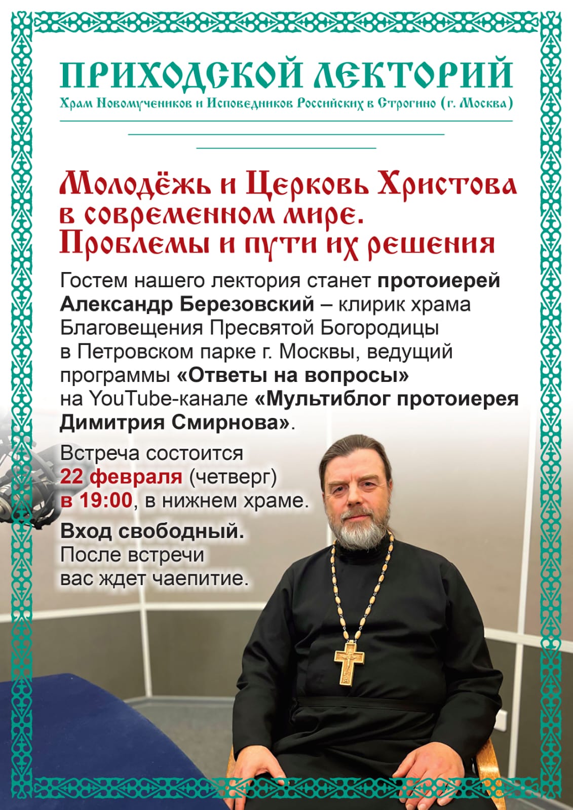 Гостем нашего лектория станет Протоиерей Александр Березовский — клирик храма Благовещения Пресвятой Богородицы в Петровском парке г. Москвы, ведущий программы