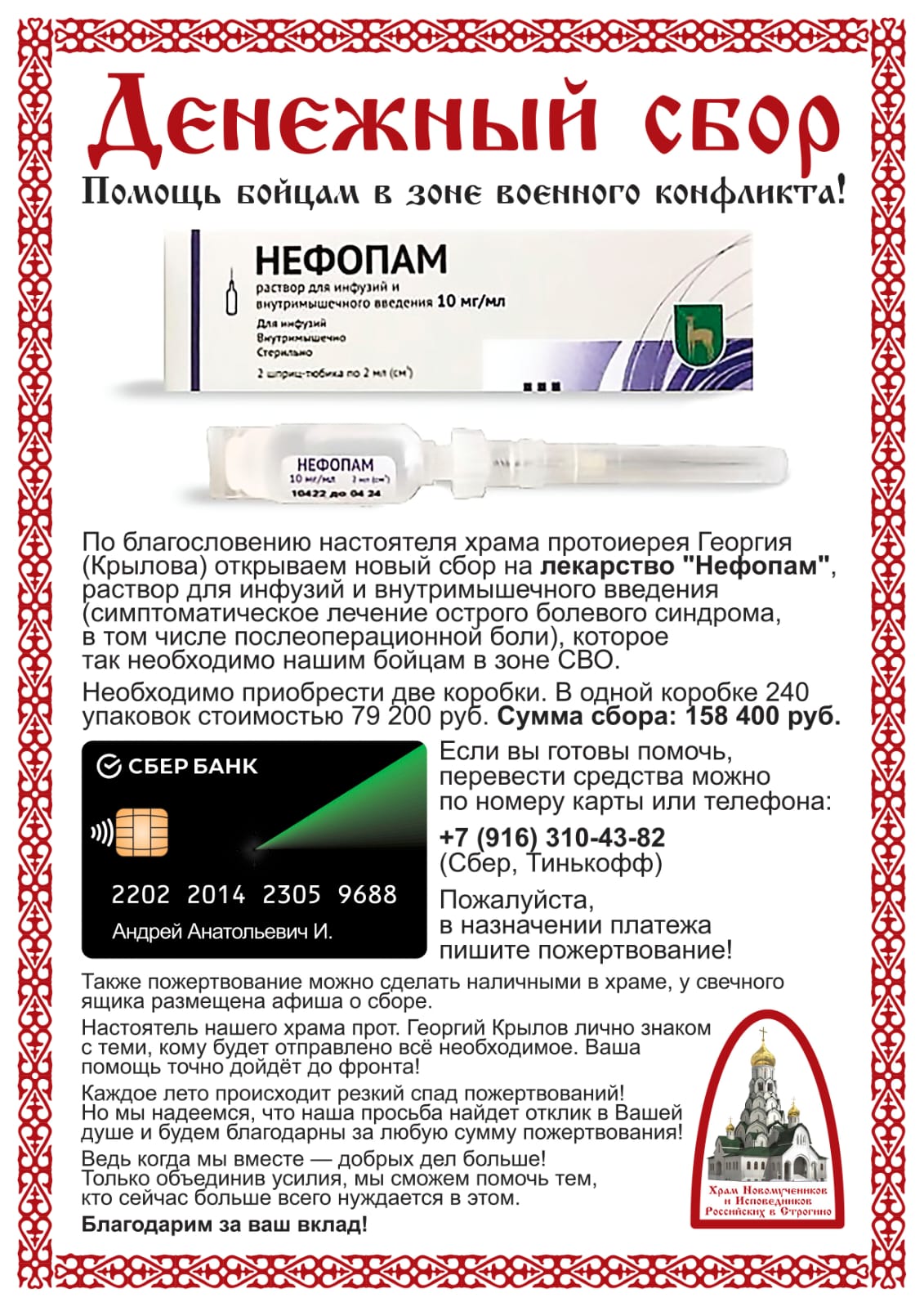По благословению настоятеля храма протоиерея Георгия Крылова открываем новый сбор на "Нефопам" - раствор для инфузий и внутримышечного введения (симптоматическое лечение острого болевого синдрома, в том числе послеоперационной боли), которое так необходимо нашим бойцам в зоне СВО.