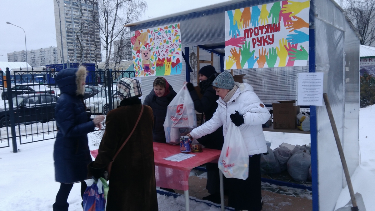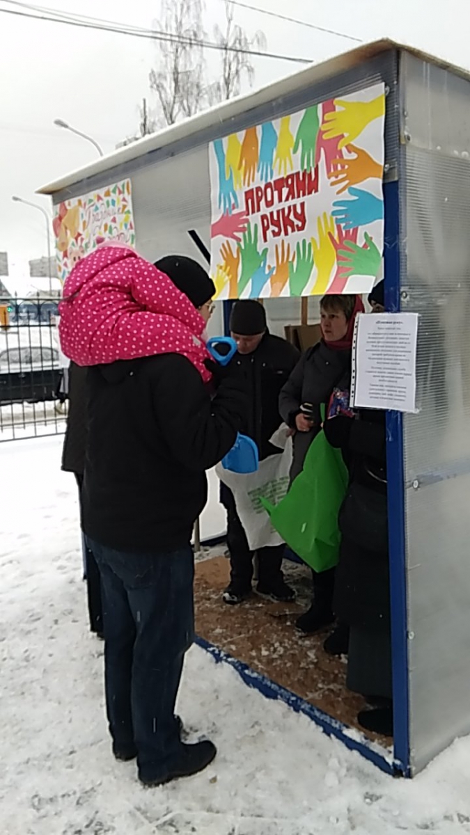 Акция «Протяни руку» направлена на сбор помощи для людей, которые, оказавшись в беде, обратились за помощью в наш Храм. Эти люди, прежде всего, нуждаются в самых простых вещах – в еде и теплой одежде. И эта наша просьба оказалась близка сердцу наших прихожан. Мы собрали немало консервов и одежды. До сего дня, чтобы собрать нашему подопечному продуктовую сумку, мы были вынуждены с каждым из них идти в ближайший дисконтный продуктовый магазин. Это было, и накладно в материальном плане, и требовало немало времени. Теперь благодаря вашей помощи мы сформировали небольшой продуктовый и вещевой запас, который будет раздаваться нашим подопечным. Служба «Помощь в беде» будет стараться рационально его использовать, но когда-нибудь и он иссякнет, и тогда мы будем вынуждены обратиться к вам за помощью еще раз. Так что и акция «Протяни руку» будет проходить в нашем Храме регулярно. А мужские вещи, особенно теплые, и мужскую обувь вы можете приносить в наш Храм постоянно и передавать за свечной ящик, говоря, что это для службы "Помощь в беде".