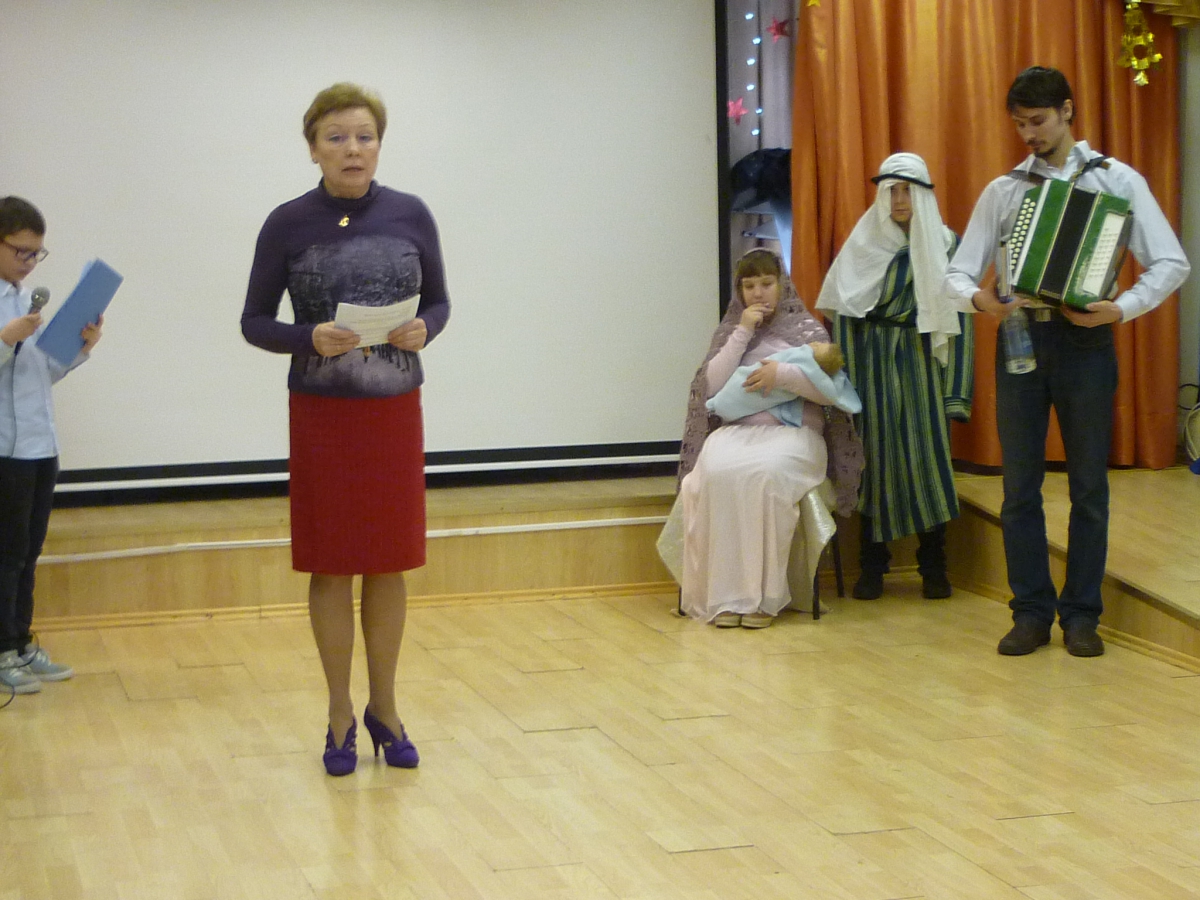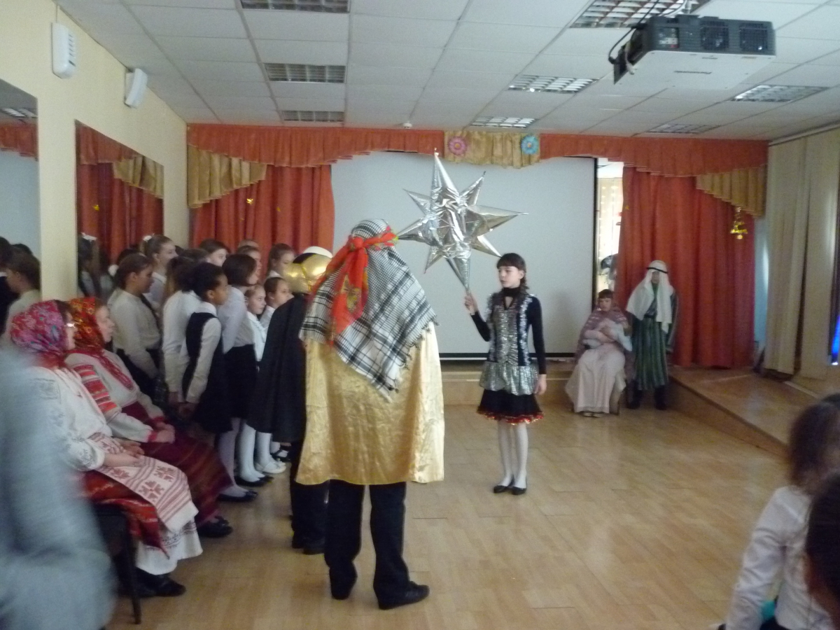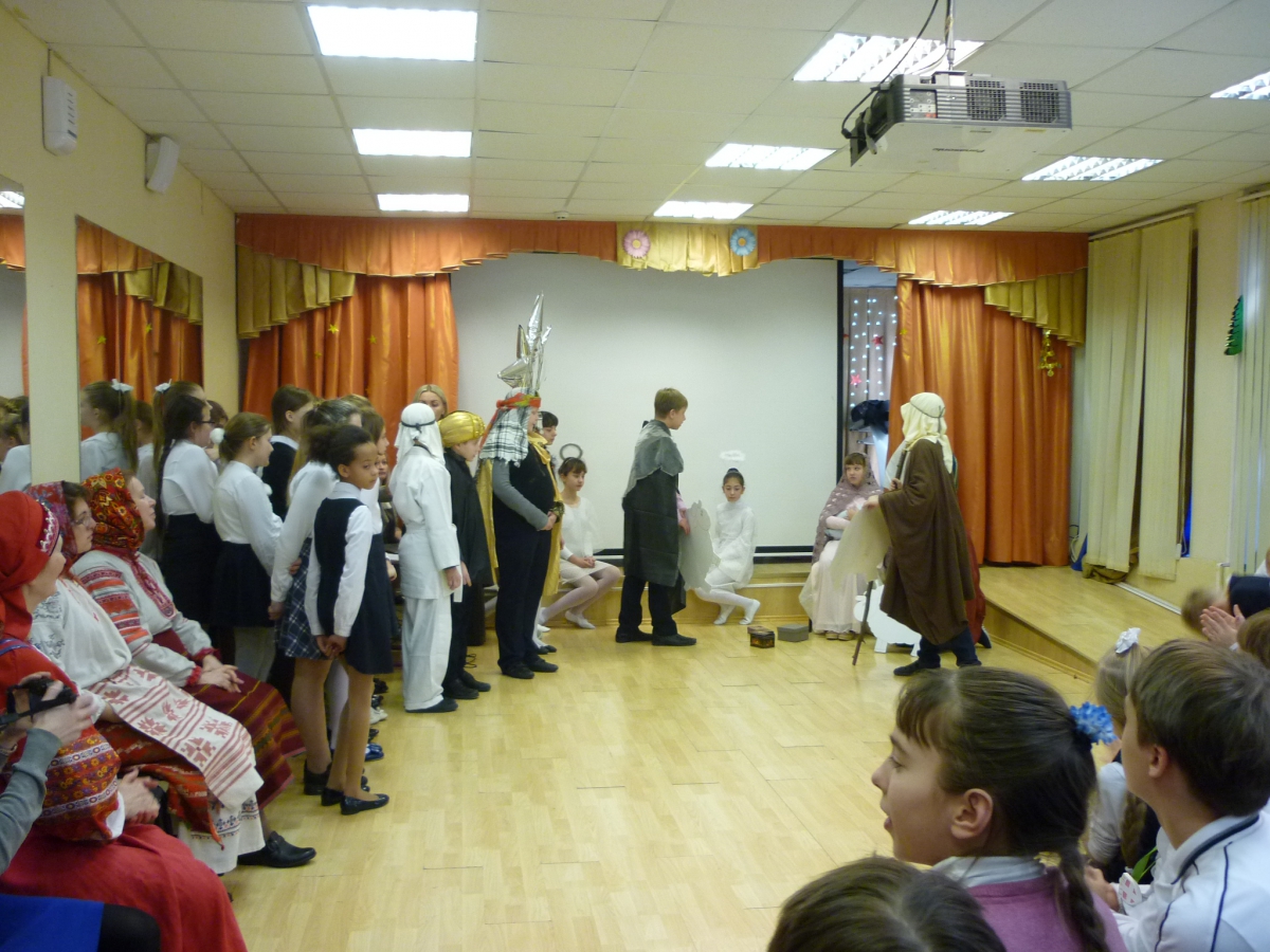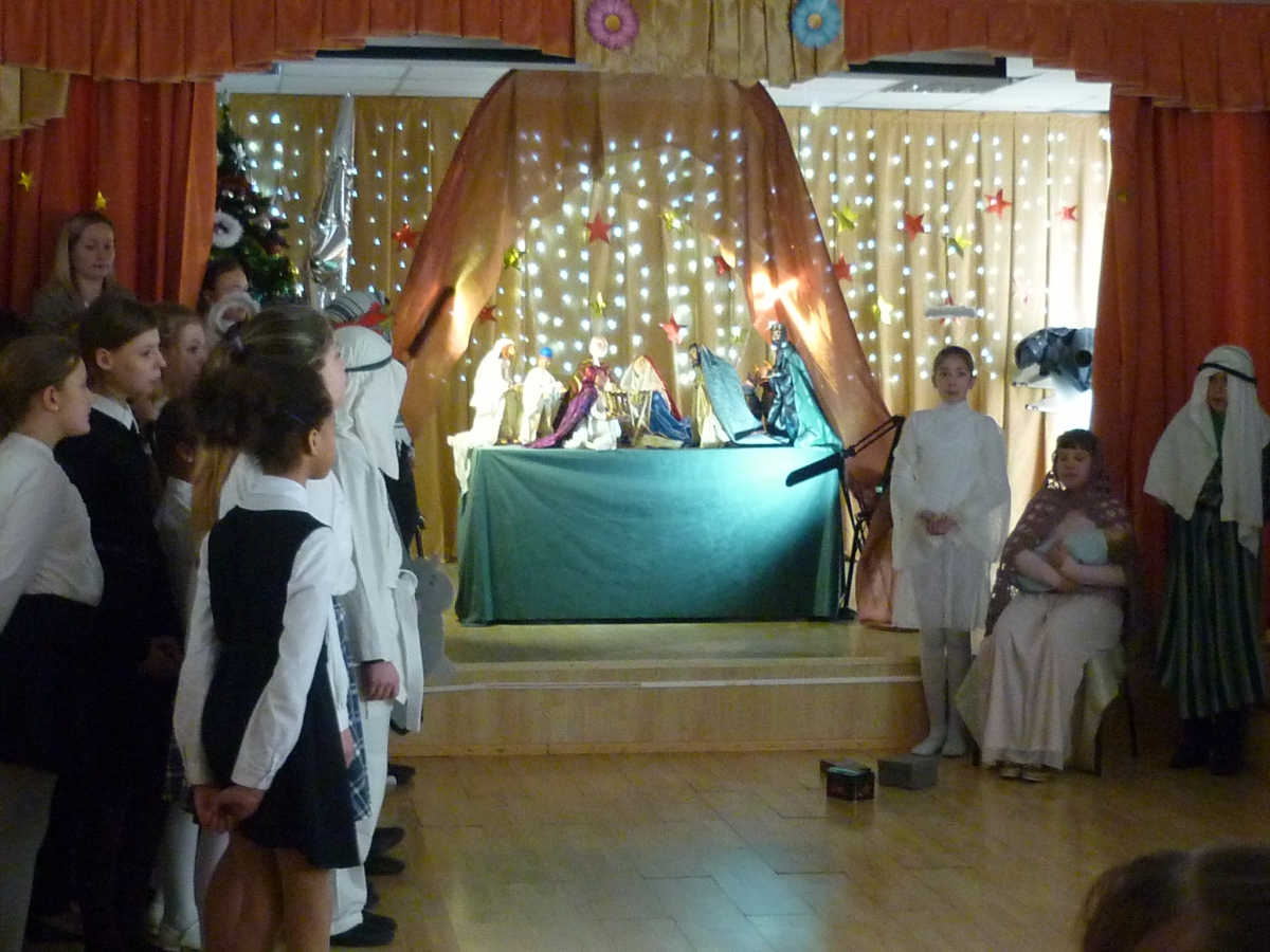 Начался концерт с совместной молитвы. Группа нашего храма «Милосердие», в лице Ольги Литвиненко и Анны Демиденко, вместе со всеми зрителями спели тропарь Рождества Христова, а затем в живом диалоге выяснили основные особенности Праздника Рождества Христова. После нескольких рождественских колядок, таких как «Ночь тиха над Палестиной», «Сын Божий народился», которые ребята слушали завороженно, их сверстники показали представление на тему Рождества Христова.