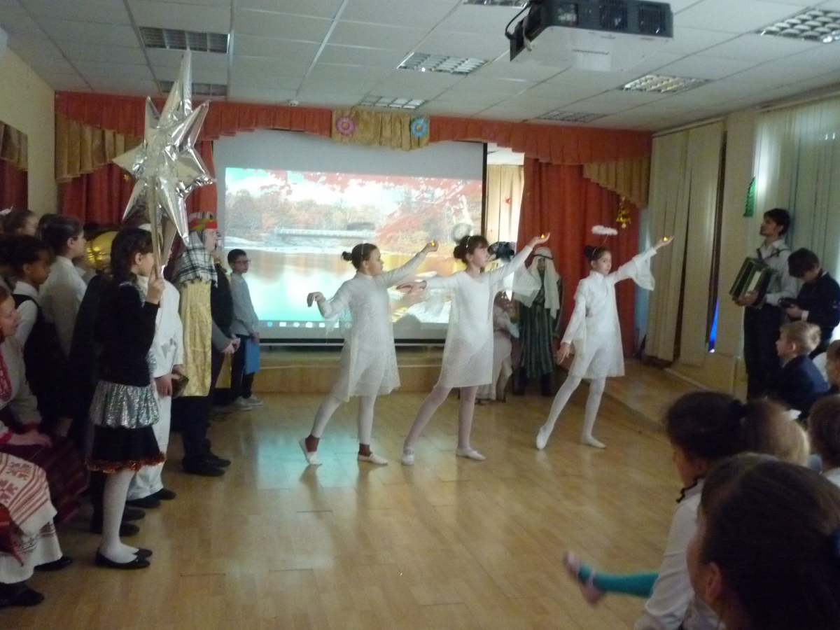 Завершился спектакль поднятием экрана, за которым появился вертеп со звездным небом на заднем фоне, с любовью приготовленный нашим мастером Горбатовой Ольгой Владимировной. Это сопровождалось чтением стихотворения Бориса Пастернака «Рождественская звезда». А после спектакля мы пригласили ребят в наши храмовые кружки, и, конечно же поиграли с ними в русские народные игры.