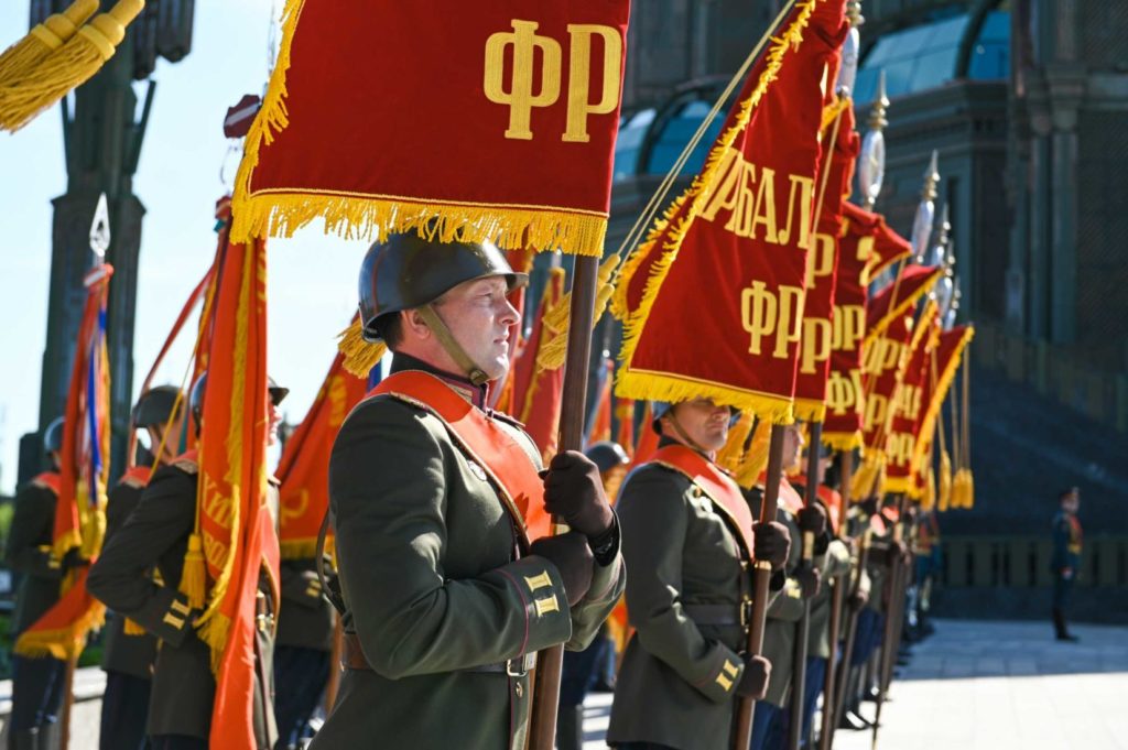 На площади перед собором были построены парадные расчеты родов войск, рота почетного караула, а также знамённые группы боевых исторических знамен и штандартов фронтов Великой Отечественной войны.