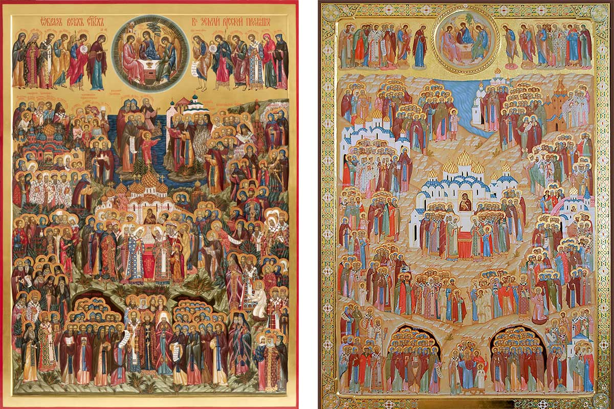 Собор святых, в земле русской просиявших. Иконы. Расположение святых по сторонам света от корня – Киева с его Лаврой, к сердцевине – Москве, вокруг образа Святой Троицы, с предстоящими у Престола Успенского Собора Кремля святителями Московскими, венчается кроной – Северной Фиваидой, и осеняется чудотворными образами Богоматери – Владимирской, Казанской, «Знамение»