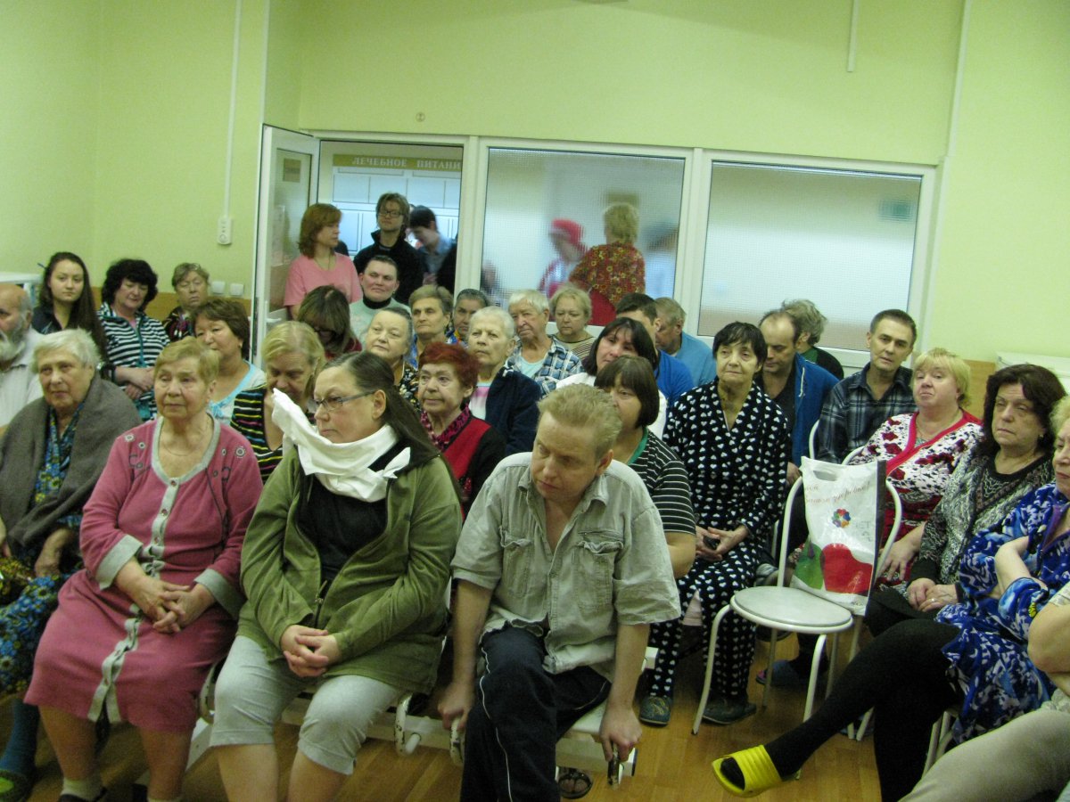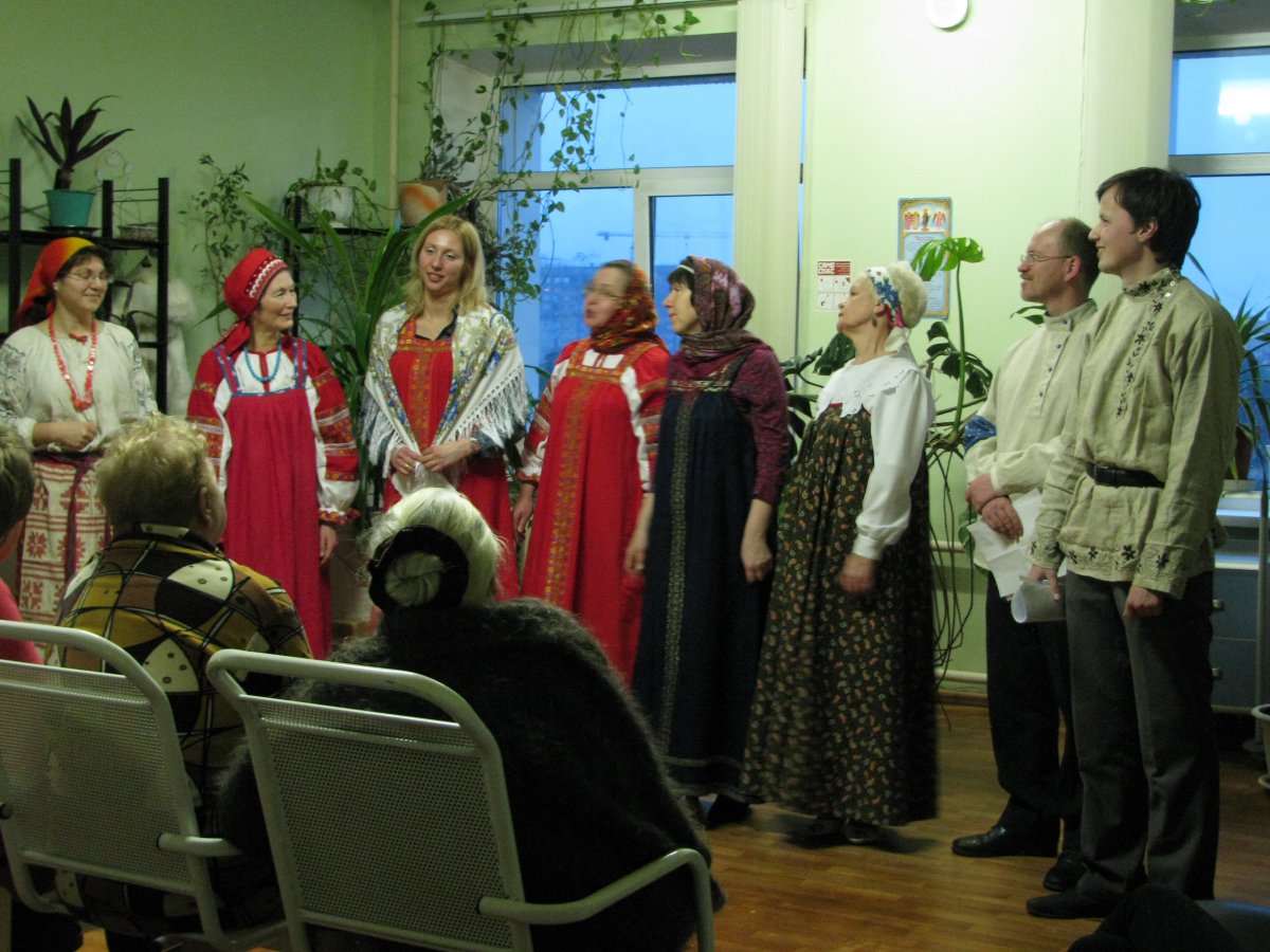 Вот, как это было. До начала концерта участники в народных костюмах идут по всем этажам и палатам корпуса, поздравляя больных с праздником и приглашая всех собраться на концерт на одном из этажей в холле или столовой. Те, кто может ходить, и те, кто в колясках, потихонечку начинают собираться, а к тем, кто не может ходить, мы зайдем после концерта, чтобы отдельно поздравить их и вручить подарки. На лицах слушателей видна сосредоточенность на своем внутреннем состоянии, отчужденность и часто - выражение скорби.