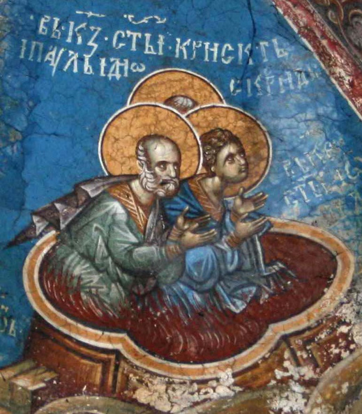 В городе Филиппах их обвинили в том, что они возмущают народ, за что святых апостолов схватили, били палками, а затем бросили в темницу. В полночь, когда святые апостолы Павел и Сила молились, внезапно произошло сильное землетрясение, оковы спали с них и двери темницы растворились. Темничный сторож, испугавшись, что узники бежали, хотел покончить с собой, но был удержан апостолом Павлом. Тогда, с трепетом припав к ногам апостолов, он с верой принял от них благовестие о Христе, вывел их из темницы, привел в свой дом, омыл их раны и крестился со всеми своими домашними.